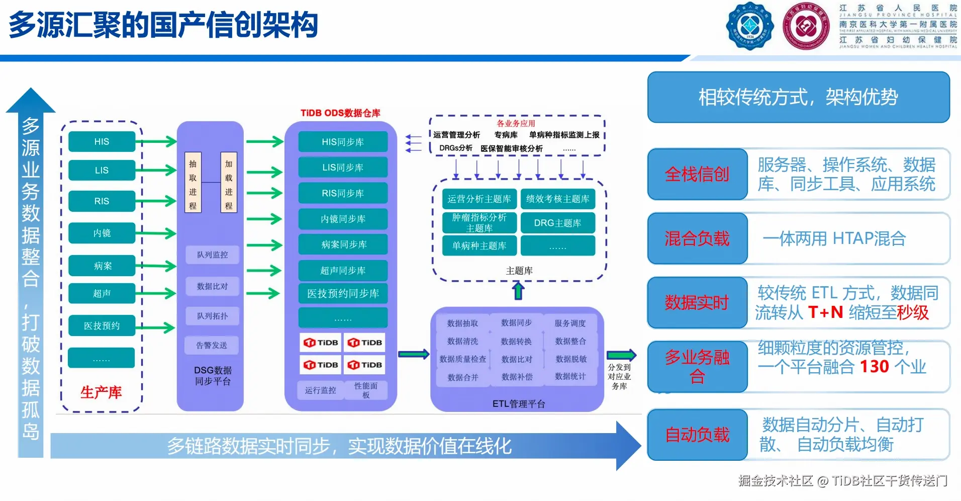 景慎旗主任介绍,医院早在 2018 年数据中心升级过程中,便引入国产分布式数据库——平凯数据库(TiDB 企业版),逐步承载核心业务系统运行。在此基础上,围绕未来智能化需求,构建了“多模态、多中心、多场景”的数据体系:不仅整合文本、影像、视频等多源数据,还实现了多院区数据融合与科研、临床等多场景贯通。