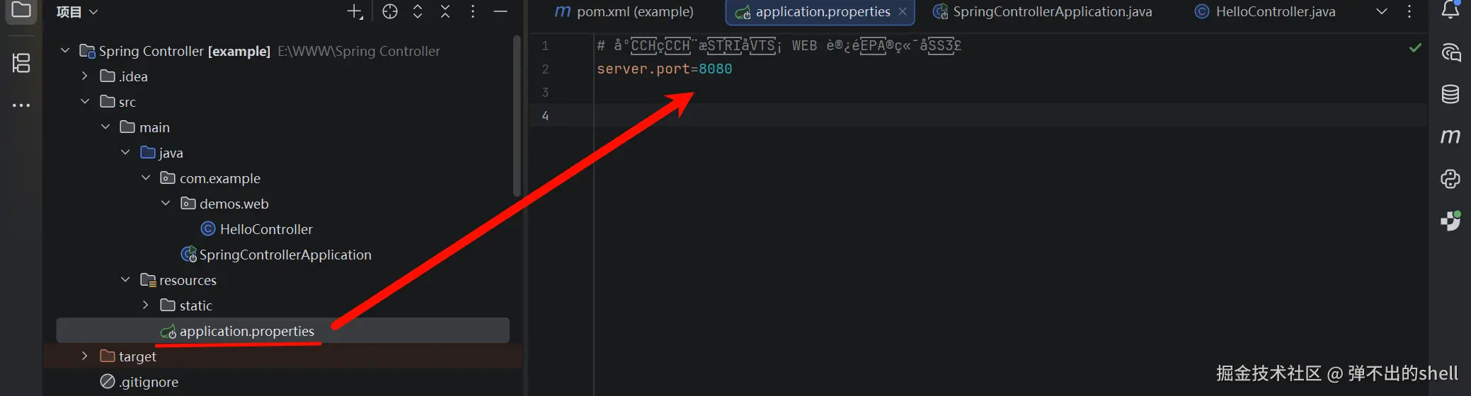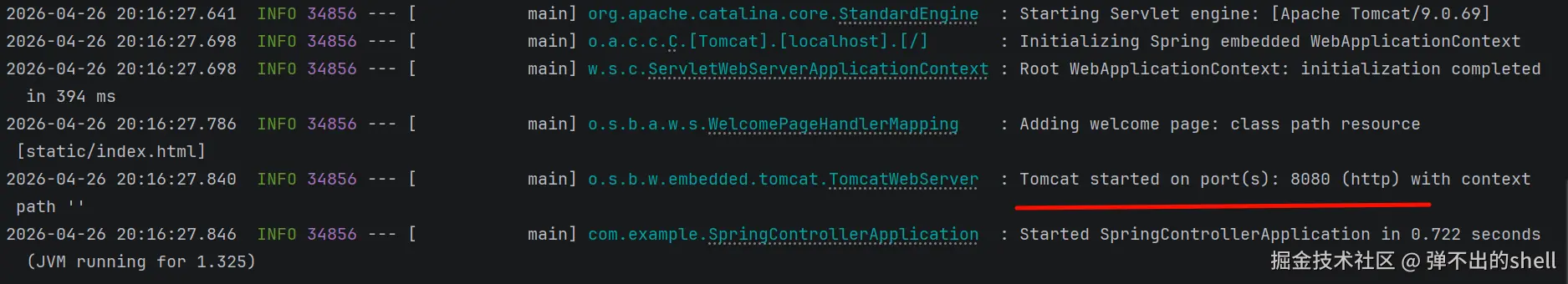 直接运行 SpringControllerApplication 文件就能启动 Web 服务,不用再自己配置 Tomcat。Spring Boot 内嵌了 Tomcat,直接运行主类它自己就把 Tomcat 启动了,这也是 Spring Boot 和传统 Spring MVC 最大的区别之一——传统 Spring MVC 需要你自己装 Tomcat、打 war 包部署,Spring Boot 直接 java -jar 就能跑。