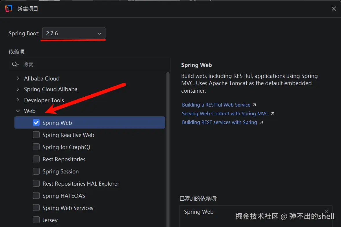 选择 2.x 系列的版本,只用添加一个 Spring Web 依赖项。