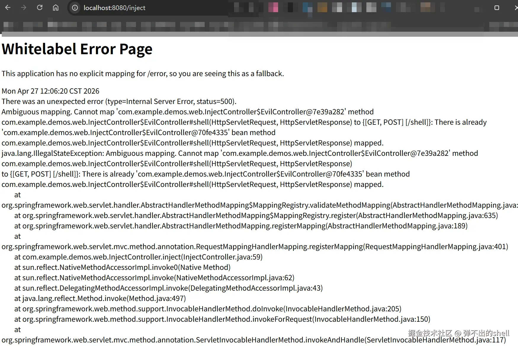Caused by: java.lang.IllegalStateException: Ambiguous mapping. Cannot map 'xxxController' methodSpring 不允许同一路径重复注册,启动就失败了。这个特性在打内存马时也要注意,注入前要确保路径没被占用。