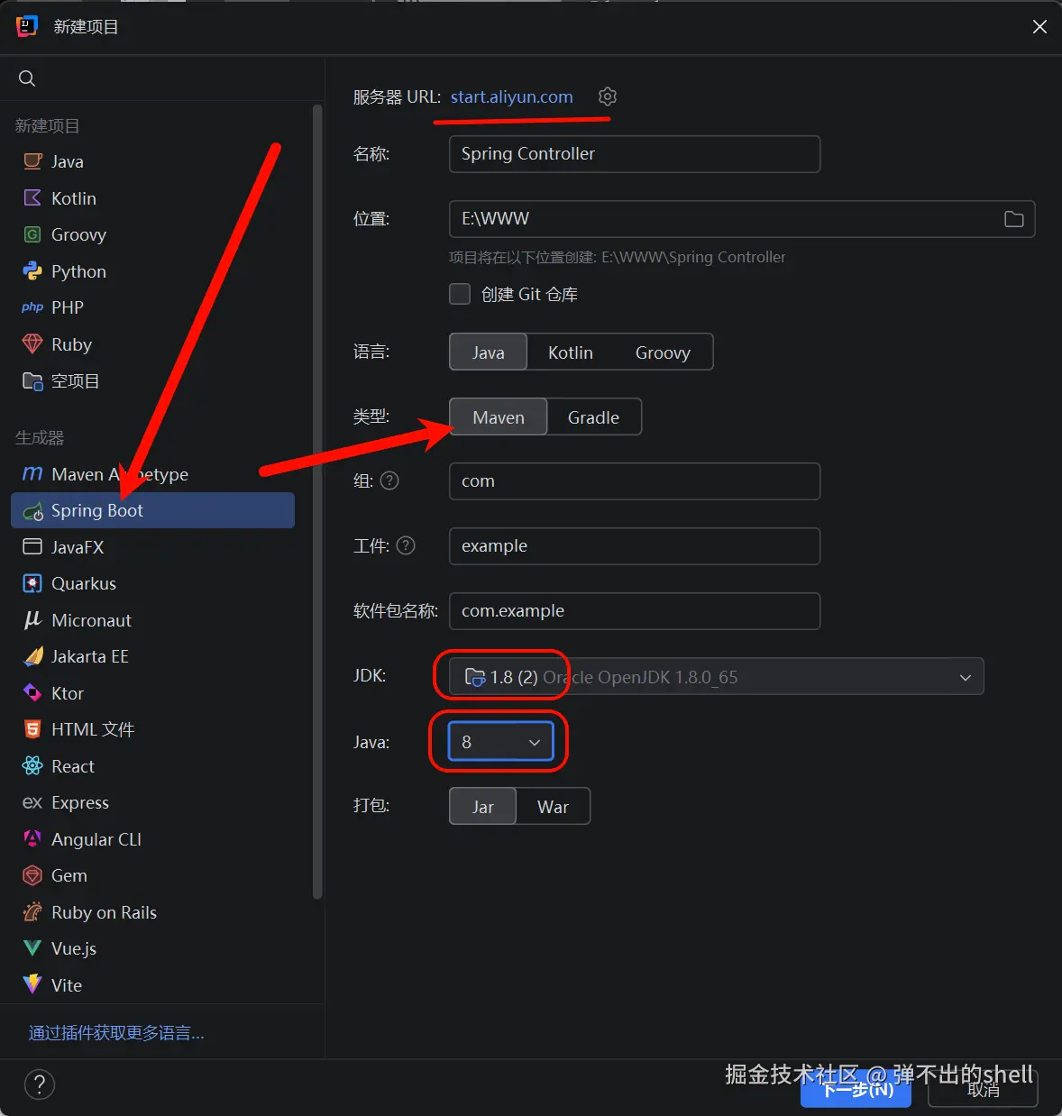 搭建一下 Spring Boot 环境,更改为 https://start.aliyun.com 源,使用 Maven,Java 8。