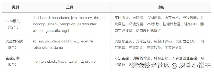 - 内置26个核心诊断工具,覆盖JVM监控、类加载、方法追踪全链路