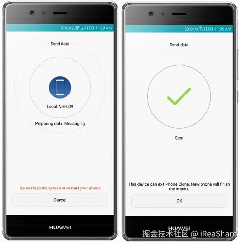 两台手机通过二维码建立连接,无需云存储,利用局域网无线完成短信迁移。 传输前可选择数据类型,支持短信与其他数据一并迁移,适合新华为手机首次设置时批量转移。