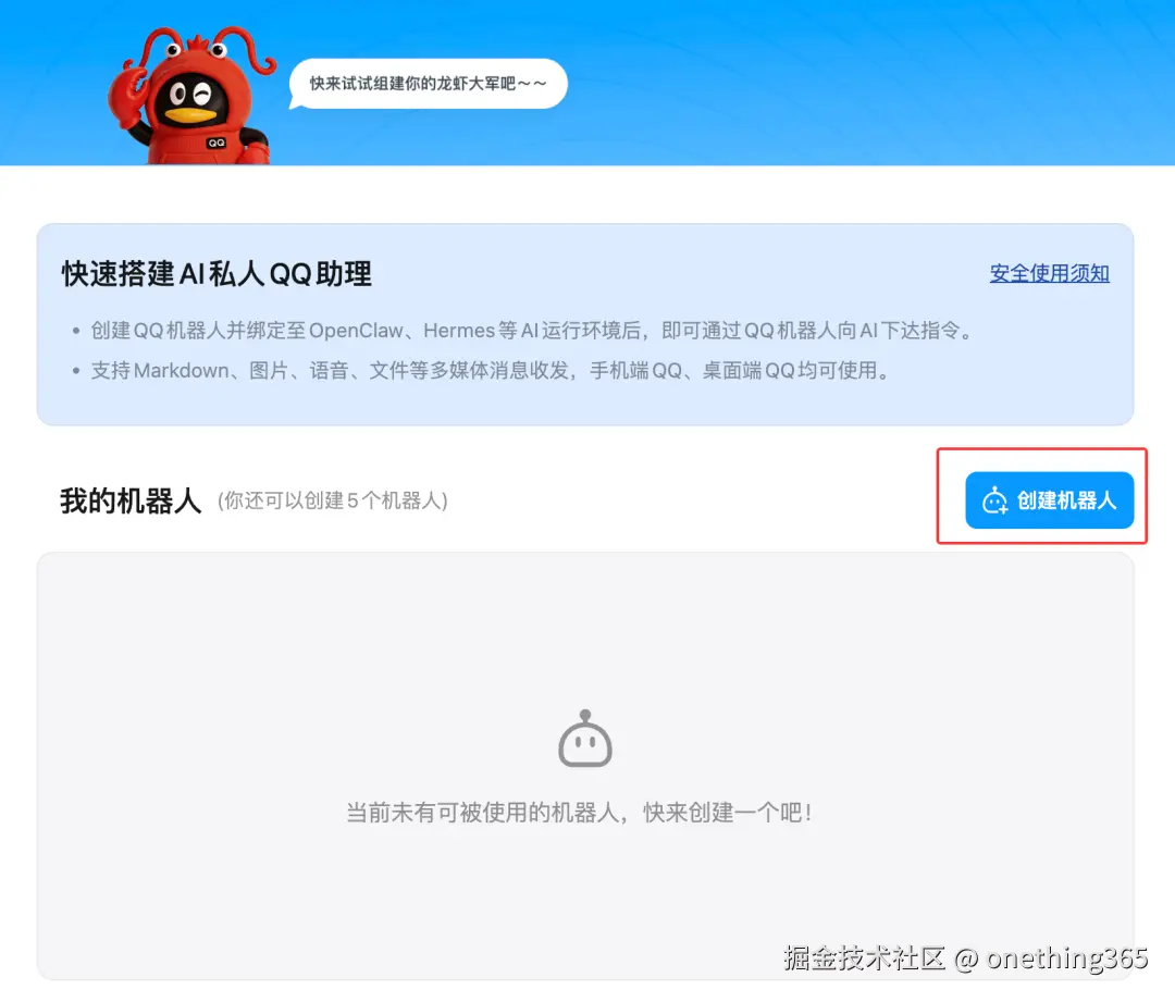 登录后,找到并点击「创建机器人」按钮。操作几乎是即时的,系统会立刻生成一个机器人账号,你的 QQ 会马上收到一条“创建成功”的系统消息。