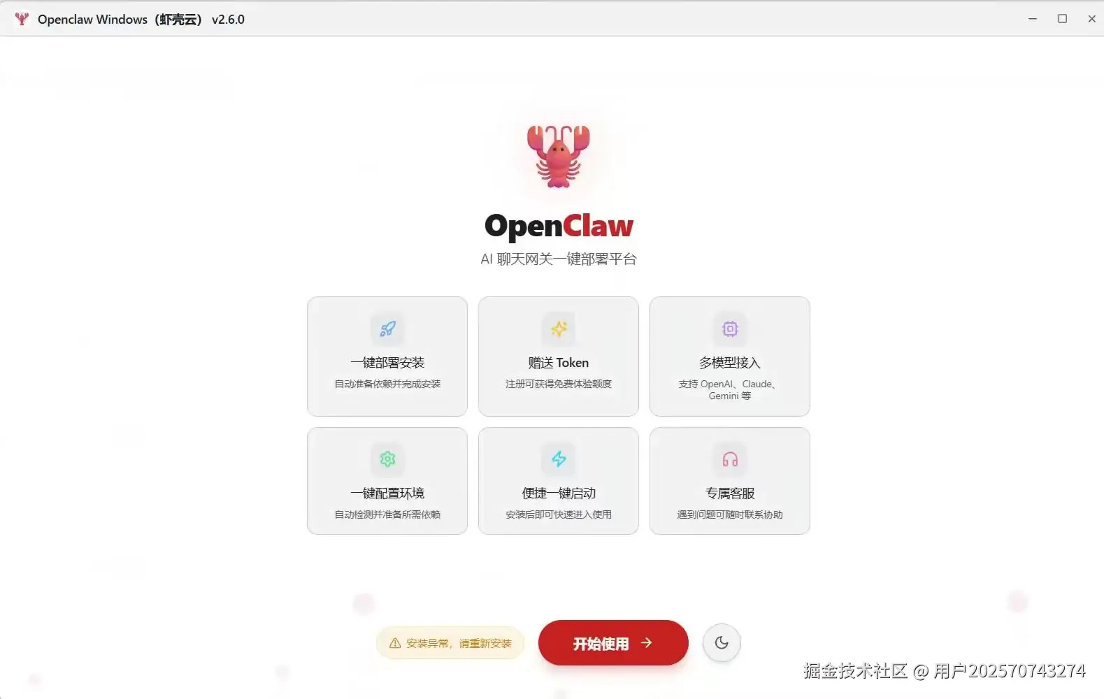 启动程序后,弹出 OpenClaw 欢迎界面(红色龙虾 Logo 醒目),点击界面底部红色「开始使用」按钮,进入安装配置页面。