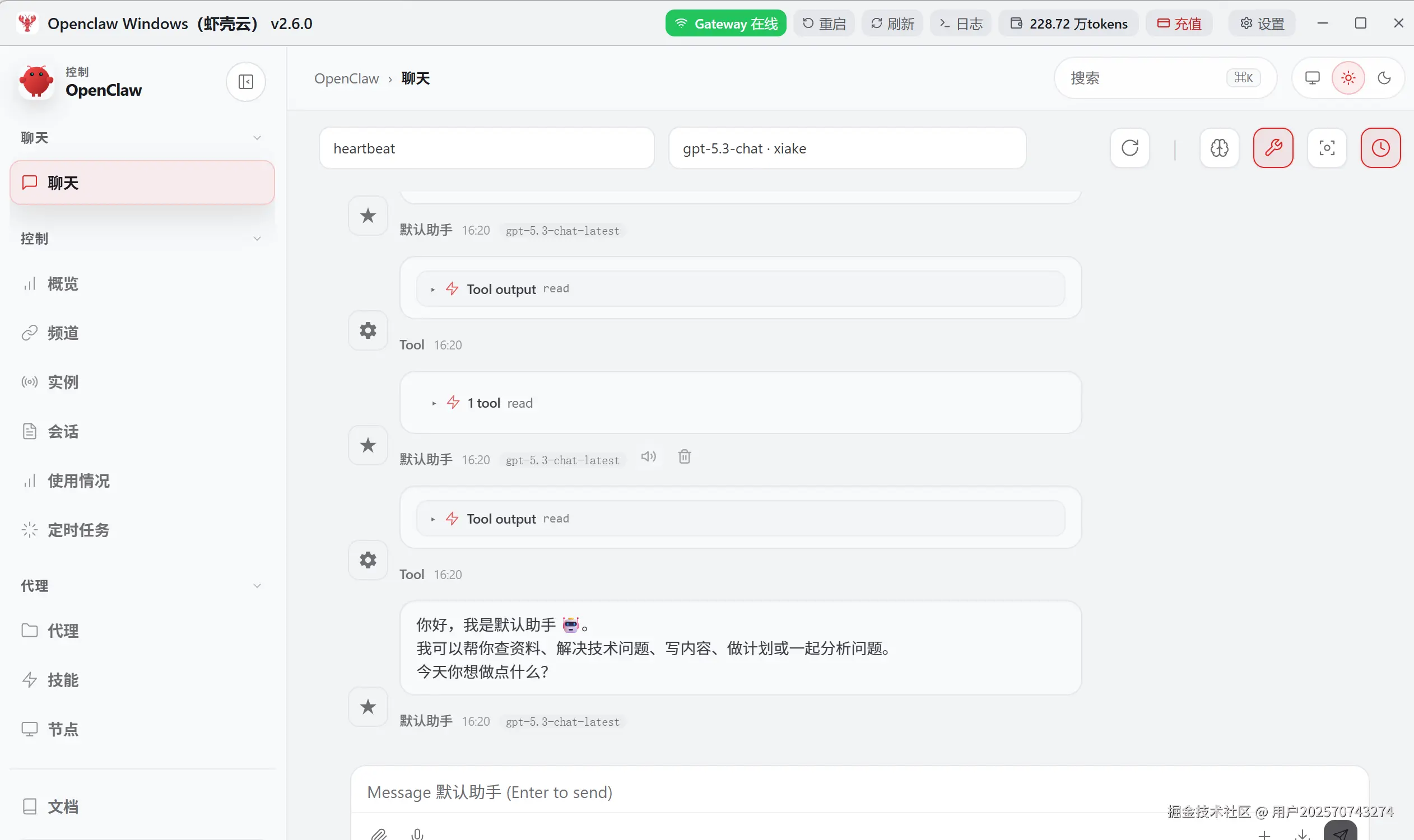 - 右上角:显示 Gateway 状态(在线 = 正常)、重启按钮、日志、剩余 Tokens(内置 28 万额度);