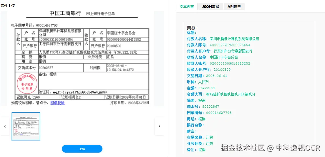 - 员工提交报销单时,常附带各类银行支付凭证。识别系统可自动提取报销凭证中的交易详情,与发票信息进行交叉验证,防止重复报销或虚假报销。这不仅提升了报销审批效率,还为企业合规审计提供了详实的数据支撑。