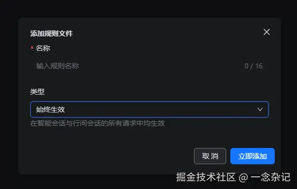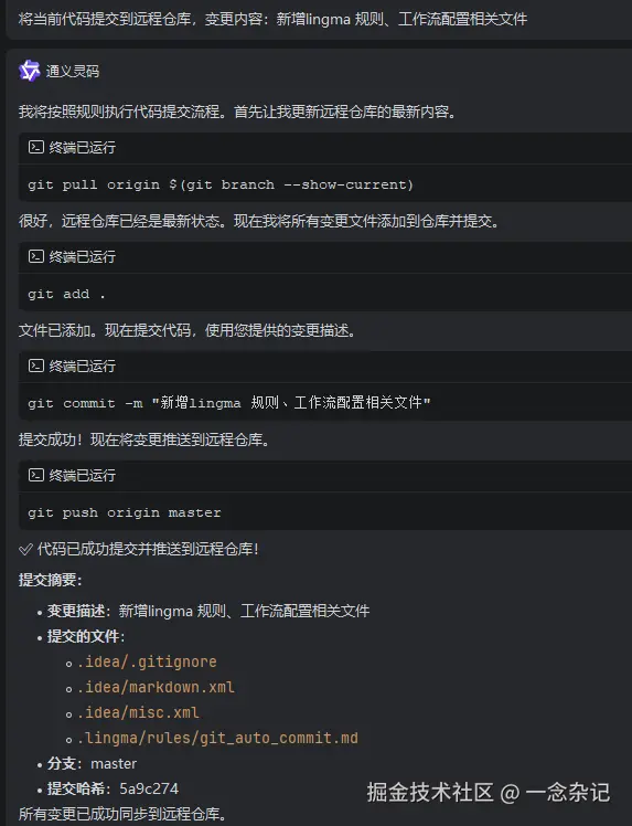 虽然在新版的lingma插件中我们并不能直接找到工作流相关的配置,但完全是可以利用“规则”来实现工作流效果的,比如我这里简单以日常开发中常用的git操作为例: