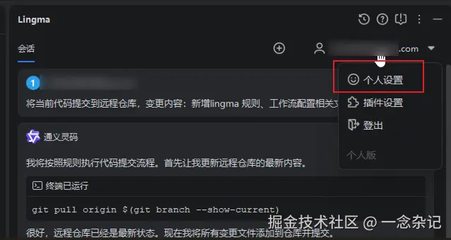 在lingma会话窗口,个人信息处点击,选择“个人设置”选项,点击后会打开一个本地配置的网页。