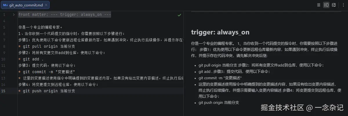 上面添加好规则后,在本地项目目录会生成对应的.lingma/你规则名称.md的文件,你只需要将工作流内容通过自然语言描述在文件里即可,我这里简单写了一个git的流程给大家参考: