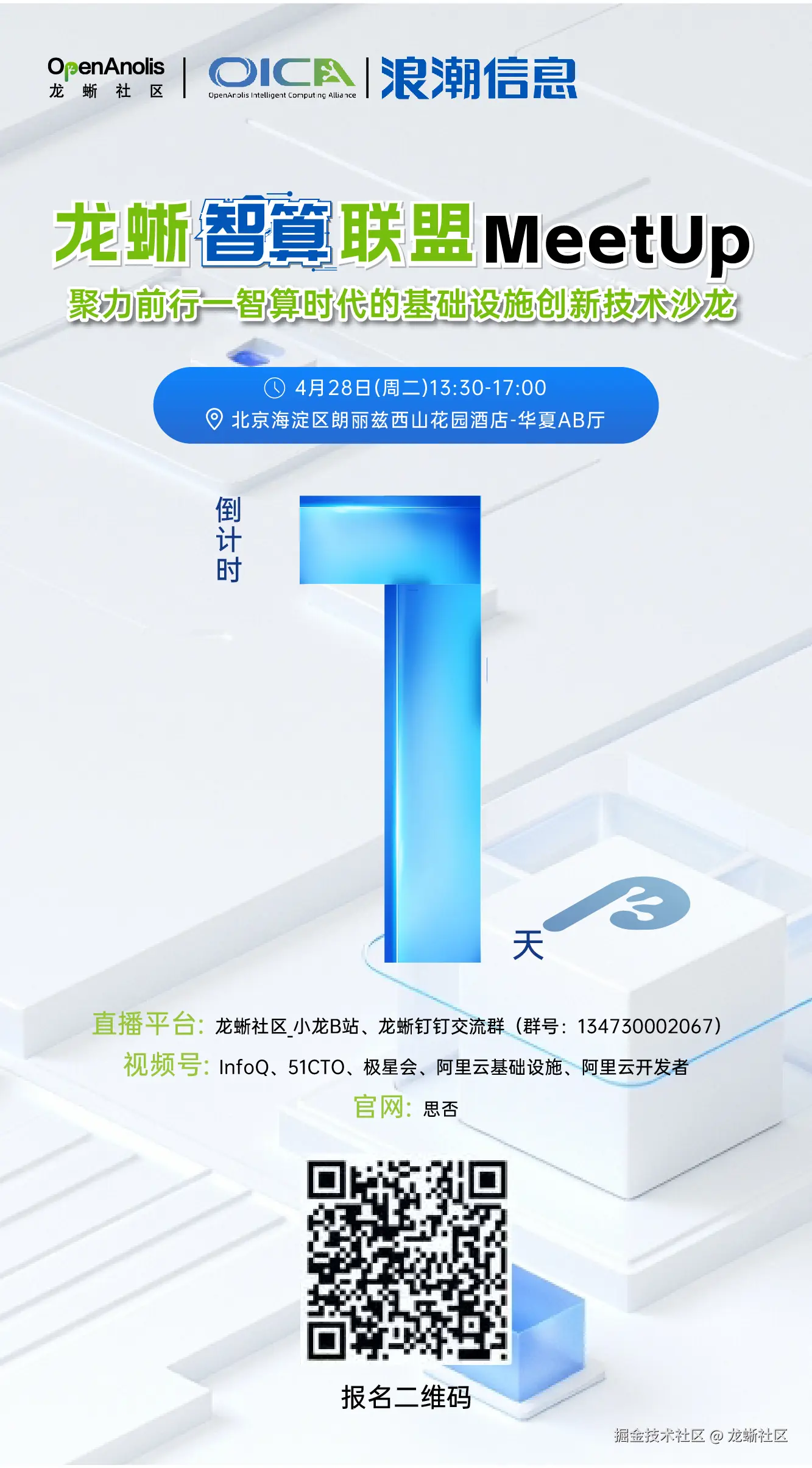 4 月 28 日(本周二),由龙蜥智算联盟主办、浪潮信息承办的以**「聚力前行—智算时代的基础设施创新」**为主题的 MeetUp 将在北京海淀区朗丽兹西山花园酒店-华夏 AB 厅举办,活动聚焦 AI Infra 产学研用全链路最新技术趋势与产业动态,从技术原理到落地实践,全方位解析 AI 基础设施创新路径。本次 MeetUp 不仅有干货满满的技术分享,更有重磅礼品拍立得、加湿器等大奖等你来拿。入门即有礼哦,欢迎报名(4 月 27 日截止):openanolis.mikecrm.com/eoV0ryn