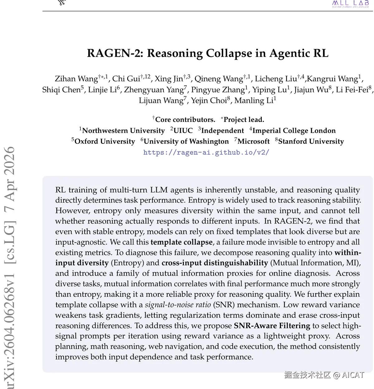然而,来自帝国理工学院、微软、斯坦福大学、牛津大学等多家顶尖机构的最新研究 RAGEN-2 揭示了一个令人不安的真相:即使熵值指标看起来一切正常,Agent 的推理能力也可能正在悄然“坍塌”。模型可能学会了生成一些看似多样、实则与具体输入无关的“万能模板”。研究者将这种全新的、现有所有指标都无法捕捉的失败模式命名为 “模板坍塌”(Template Collapse)。