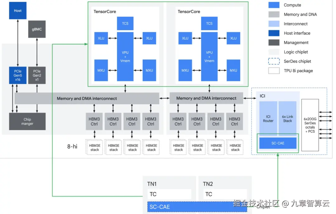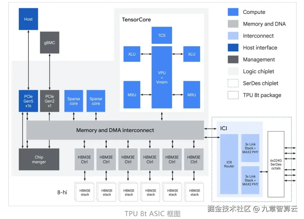 专治“偏科”的SparseCore:大模型训练中有大量像“嵌入查找”这样不规则、耗时的“杂活”。8t集成了一个专门的SparseCore来处理它们,好比给主计算单元配了个专业的助理,让其能心无旁骛地冲刺。