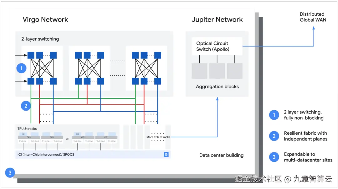 Virgo网络:连接百万芯片的血管:单颗芯片再强,也有极限。8t的真正威力在于集群。全新的Virgo网络,让单一逻辑集群可以连接超过100万颗TPU芯片,实现近乎线性的性能增长,这是为建造“AI宇宙”准备的基石。
