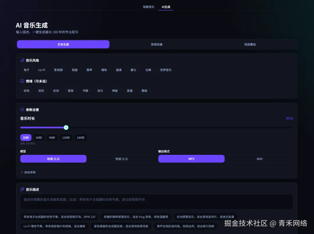 - 基础区: 文本输入、时长滑块(1-180 秒)、模型版本(Stable Audio 2.0 / 2.5)、输出格式(MP3 / WAV)