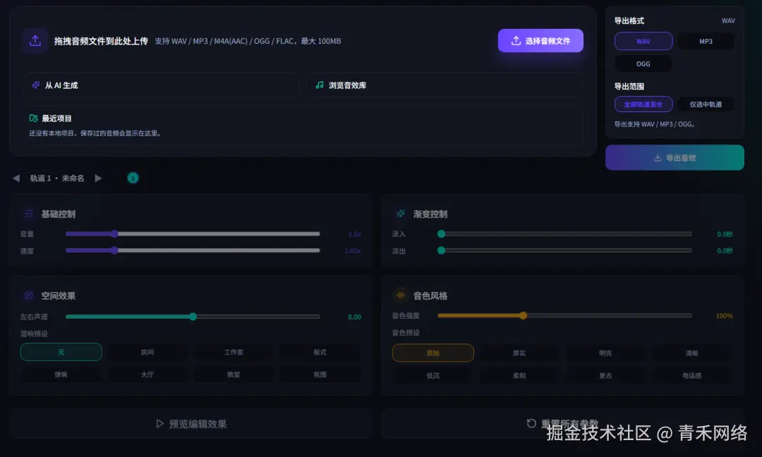从音效到音乐,从单轨到多轨,爱声音坊 (AiSounds) 在做的事情是把"创作者音频工具"这个拼图一块块补齐。技术架构上分层清晰:DeepSeek V4 Pro 做理解层,ElevenLabs 和 Stable Audio 做生成层,Web Audio API 做编辑层,各司其职。