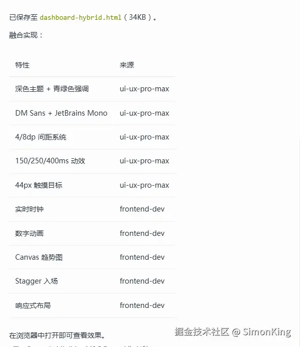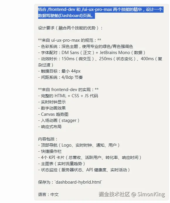 组合优势:ui-ux-pro-max 负责"设计什么",frontend-dev 负责"如何实现"。两者结合,既能保证设计品质,又能确保开发效率。