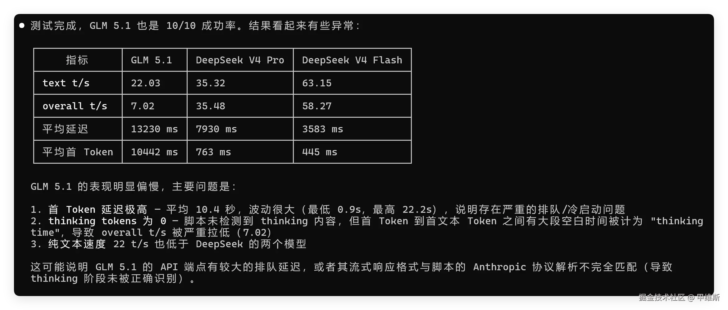 这可能说明 GLM 5.1 的 API 端点有较大的排队延迟。