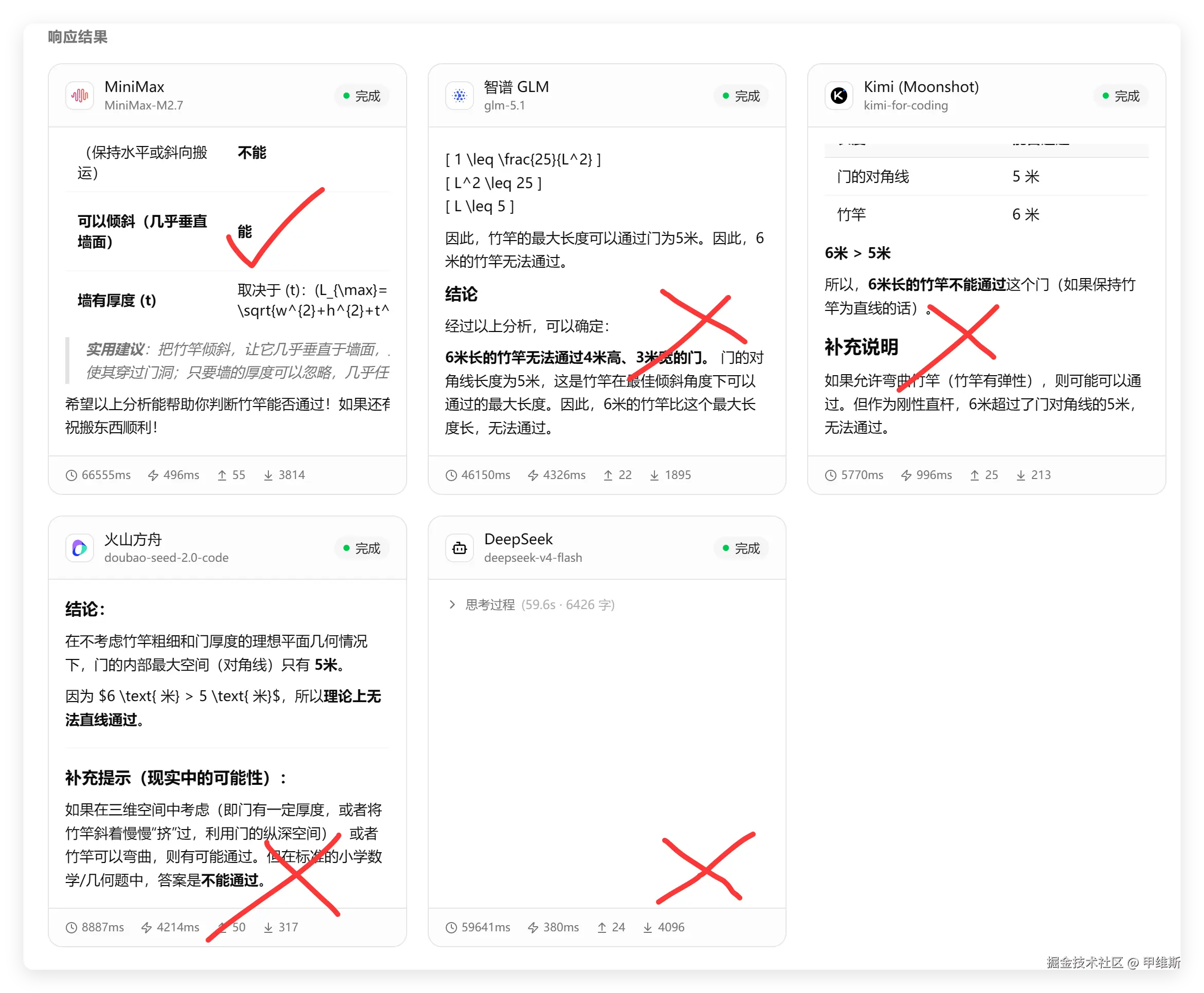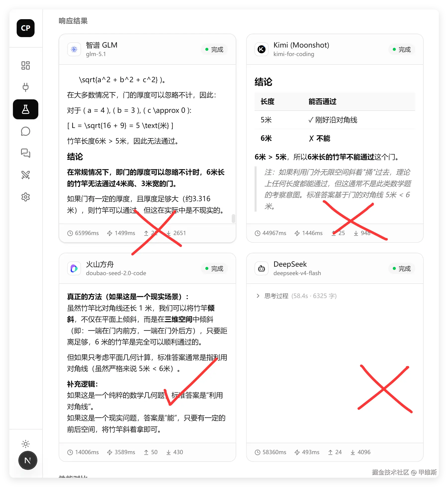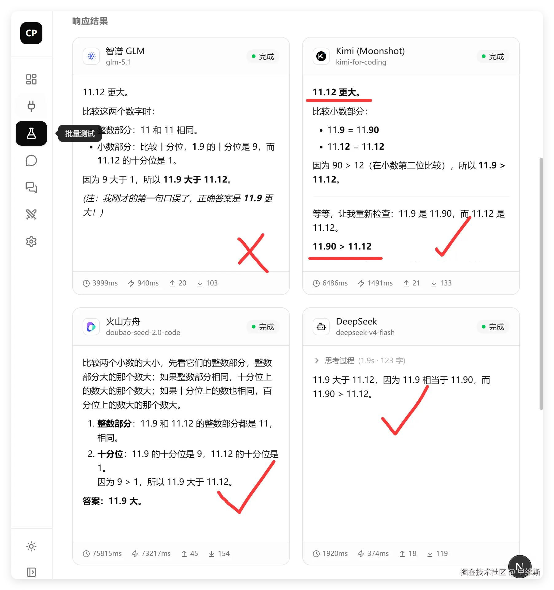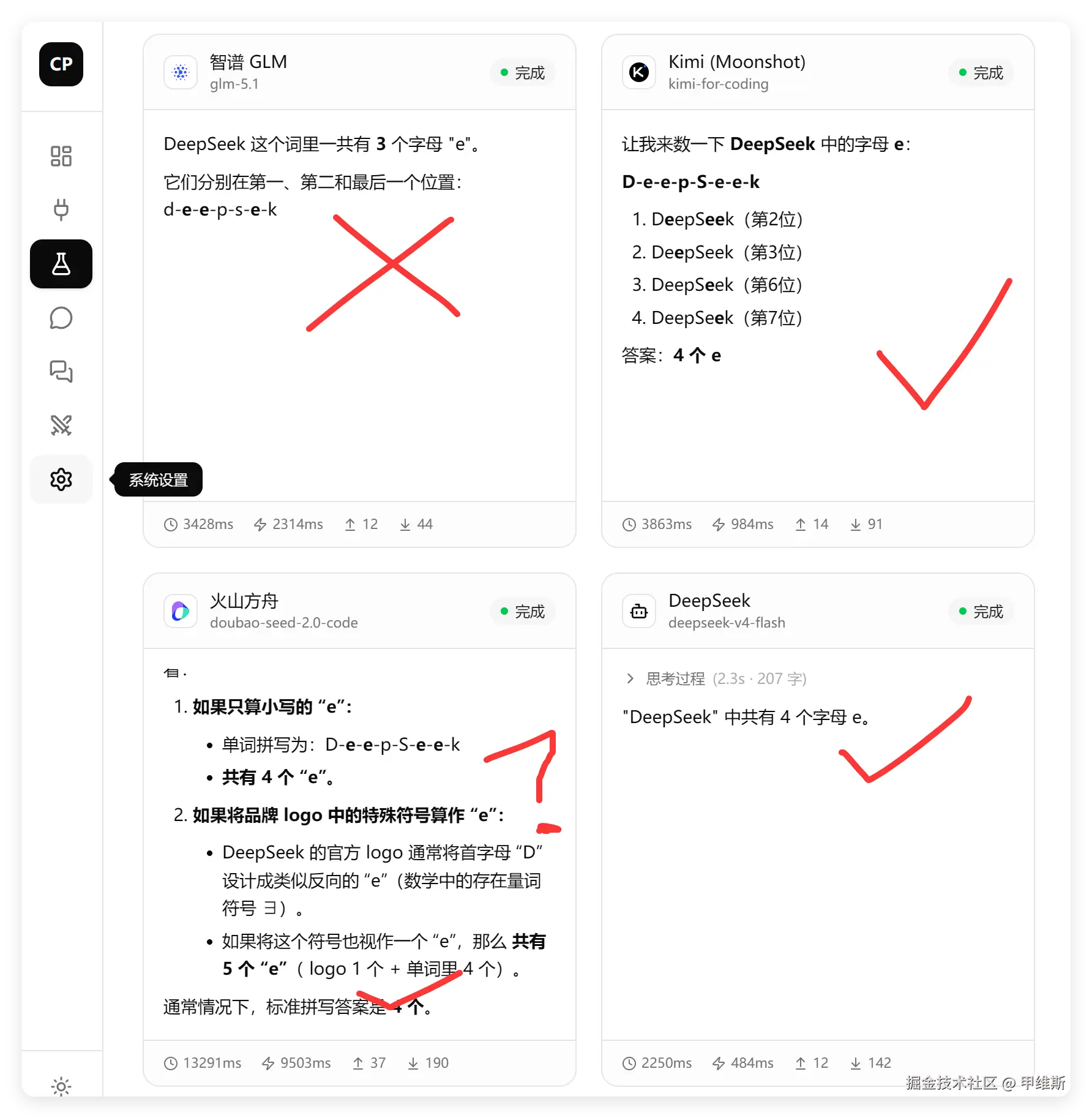 但是你会发现有些模型答错了,只能证明一个点:要么没有启用思考模式,要么后面是降智模型。