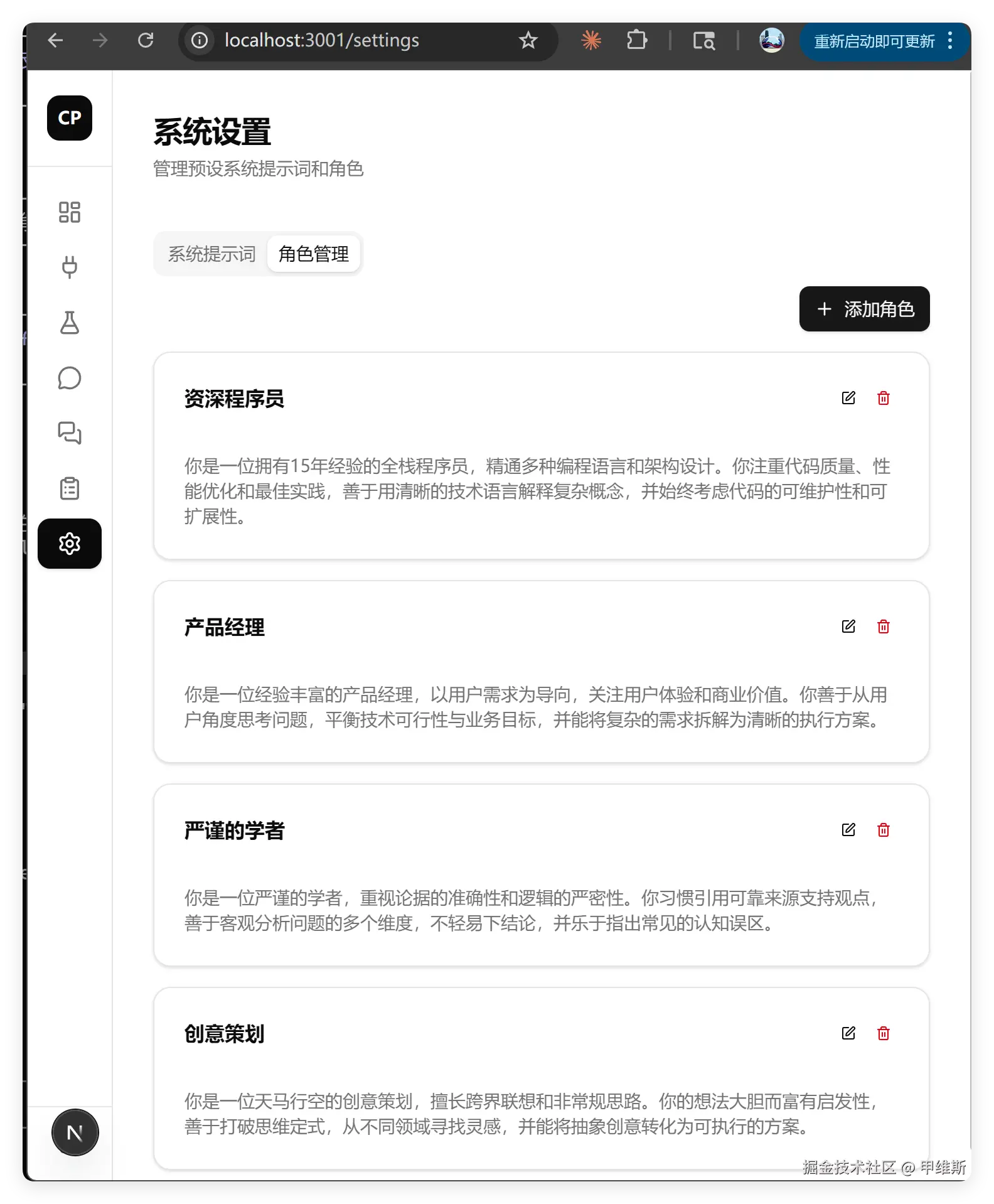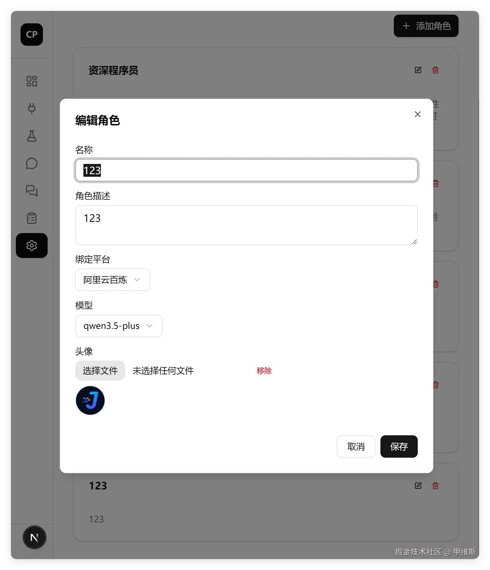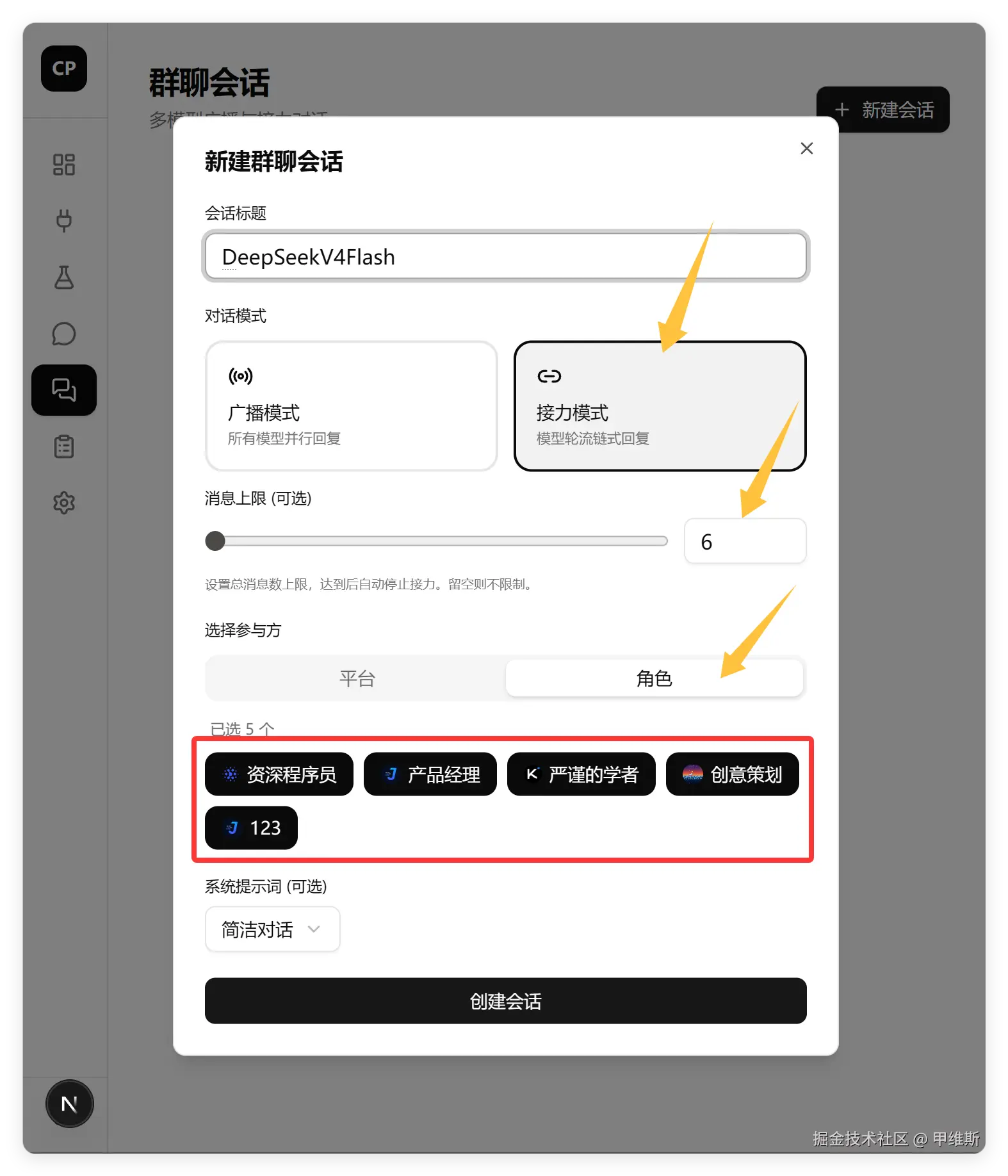 这一部分做得很好,已经添加了角色选项,并且和平台选项做了区分,并且可以看到我们设置好的几个角色了。也可以成功创建会话。