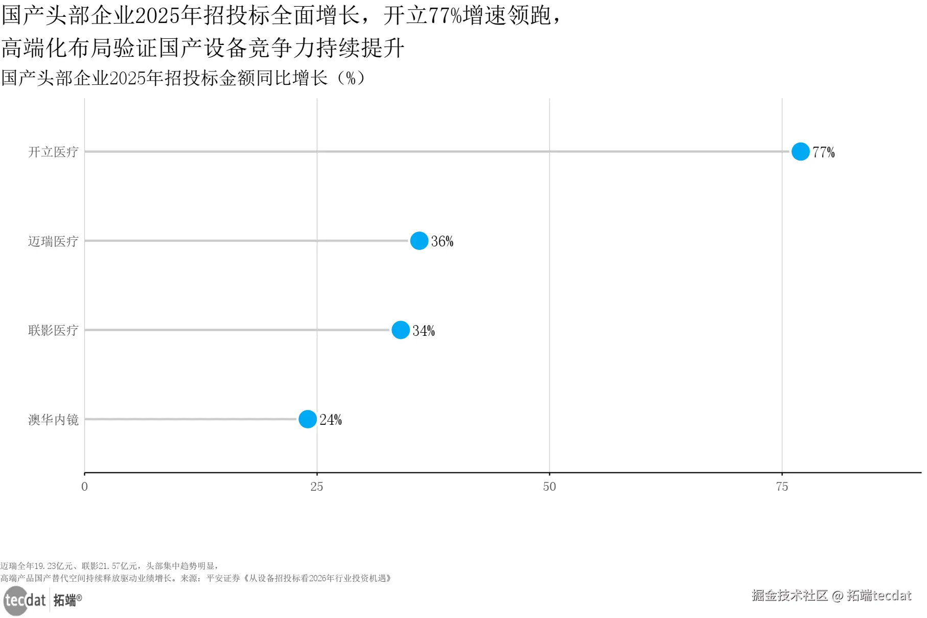 国产头部企业的招投标金额全面增长,开立医疗以77%的增速领跑,迈瑞医疗增长36%,联影医疗增长34%,澳华内镜增长24%,头部集中趋势明显(见图15)。迈瑞全年招投标金额达19.23亿元,联影达21.57亿元,高端产品国产替代空间的持续释放正在驱动企业业绩快速增长。