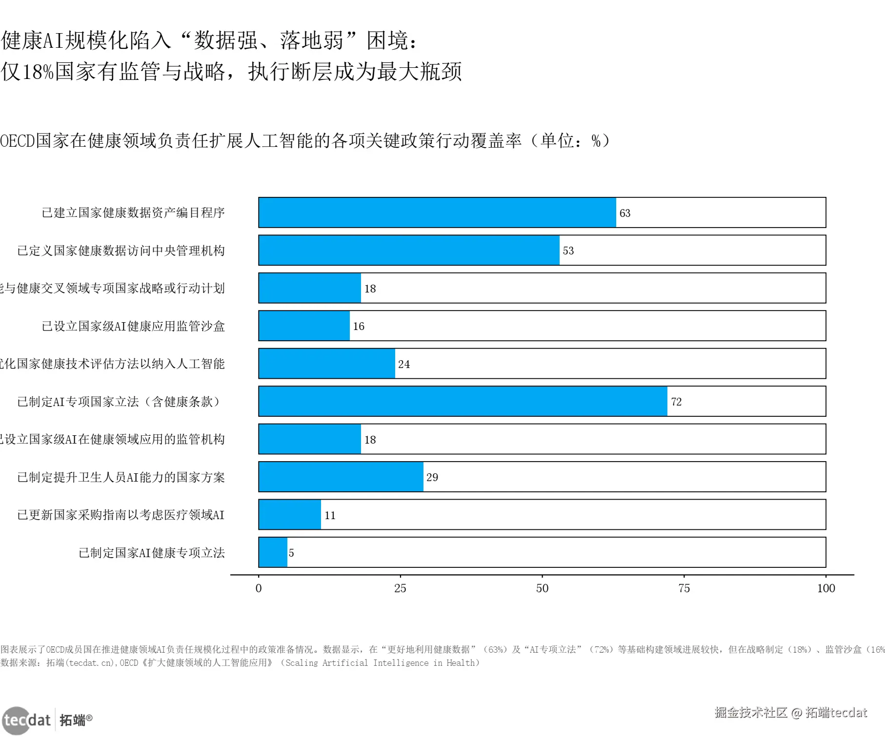 然而,AI医疗的落地并非一帆风顺。OECD于2026年4月发布的《扩大健康领域的人工智能应用》报告指出,尽管AI已100%渗透进卫生系统的行政管理环节,但在临床核心场景,真正实现全国范围内推广应用的只有10%。在38个OECD成员国中,仅有18%的国家制定了AI与健康交叉领域的专项国家战略或行动计划(见图22)。
