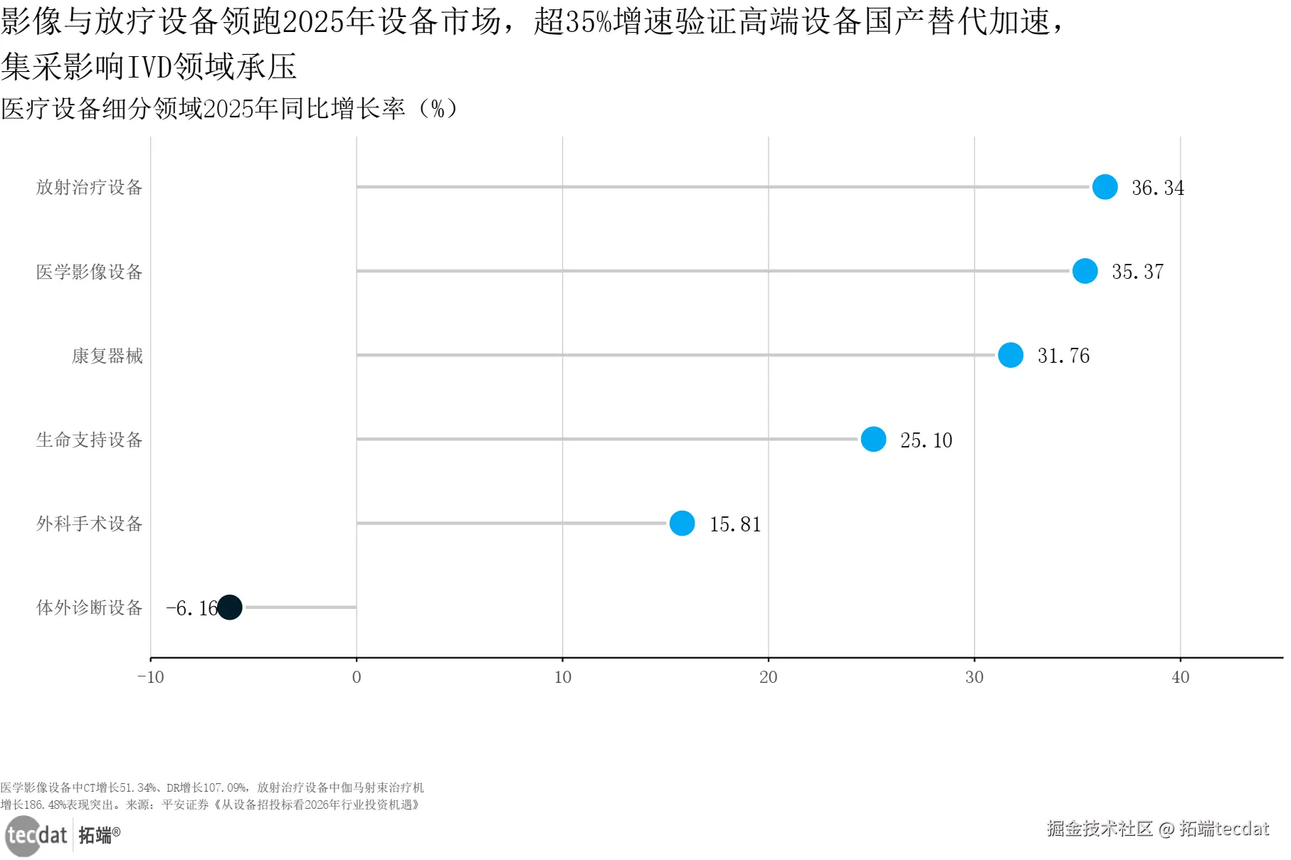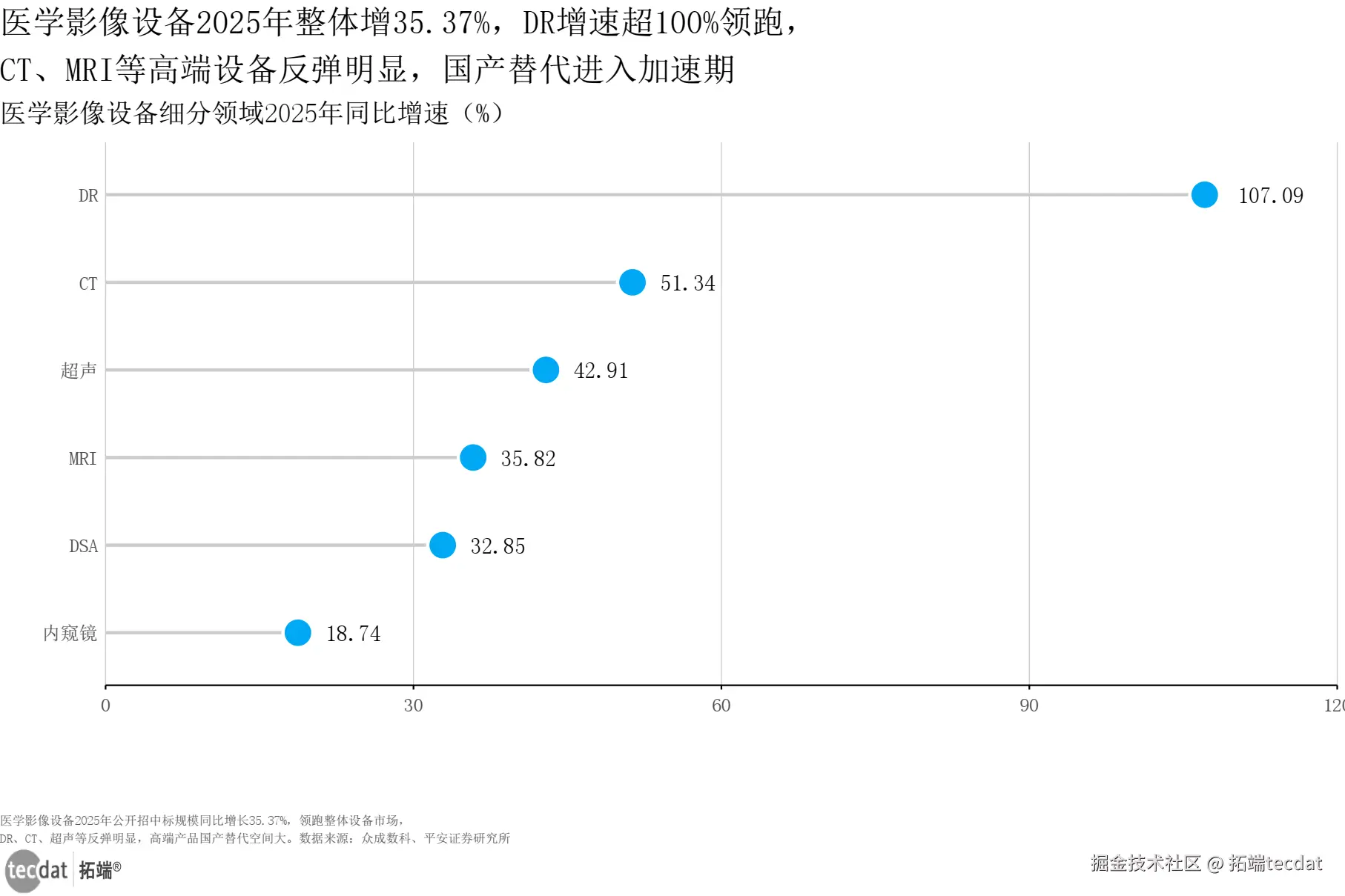 细分领域中,影像与放疗设备领跑市场,放射治疗设备同比增长36.34%,医学影像设备增长35.37%,康复器械增长31.76%,仅体外诊断设备受集采影响下降6.16%(见图12)。医学影像设备内部,DR增速高达107.09%,CT增长51.34%,超声增长42.91%,高端设备反弹明显(见图13)。