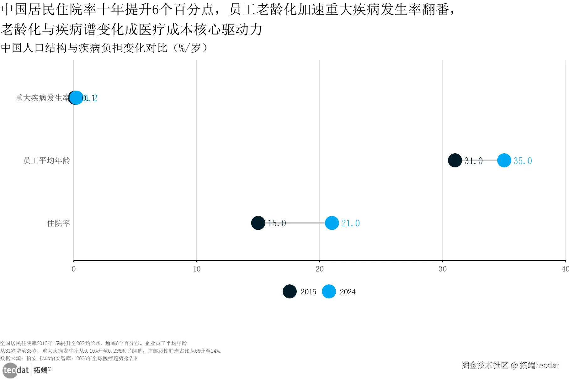 政策落地的背后,是人口结构变化带来的沉重疾病负担。全国居民住院率从2015年的15%升至2024年的21%,十年提升6个百分点;企业员工平均年龄从31岁增至35岁,重大疾病发生率近乎翻番,从0.10%升至0.23%,其中肺部恶性肿瘤占比从6%升至14%(见图3)。老龄化加速正在从根本上重塑医疗需求的结构。