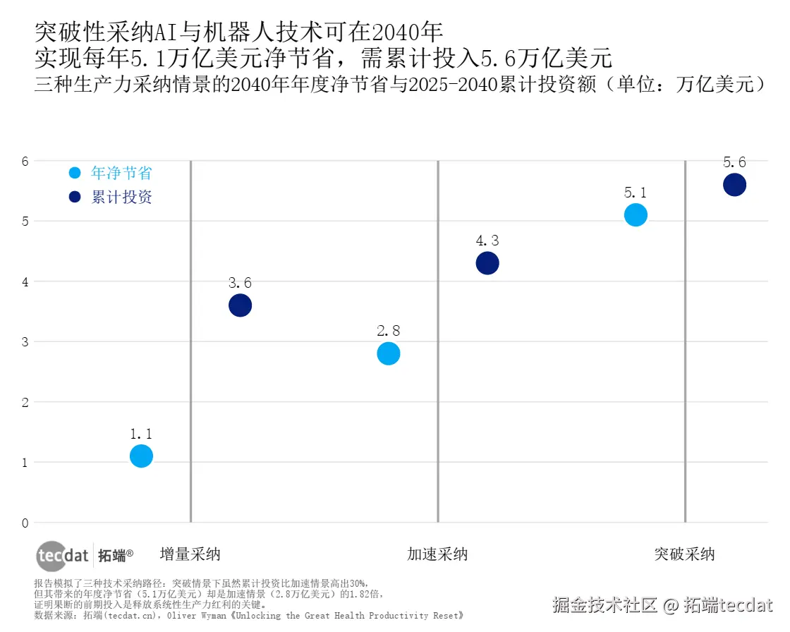 换句话说,不是病人变多了我们才花更多钱,而是系统本身“变慢了、变笨了”。面对这个8.6万亿美元的效率缺口,传统的“控制药价、削减预算”的思路已经走不通。报告量化模拟了三种生产力提升路径,结果显示:如果采取突破采纳策略,果断投入并系统重构医疗工作流,2040年每年可净节省5.1万亿美元,成本降低22%,投入产出比远超保守试点和系统推广模式(见图20)。