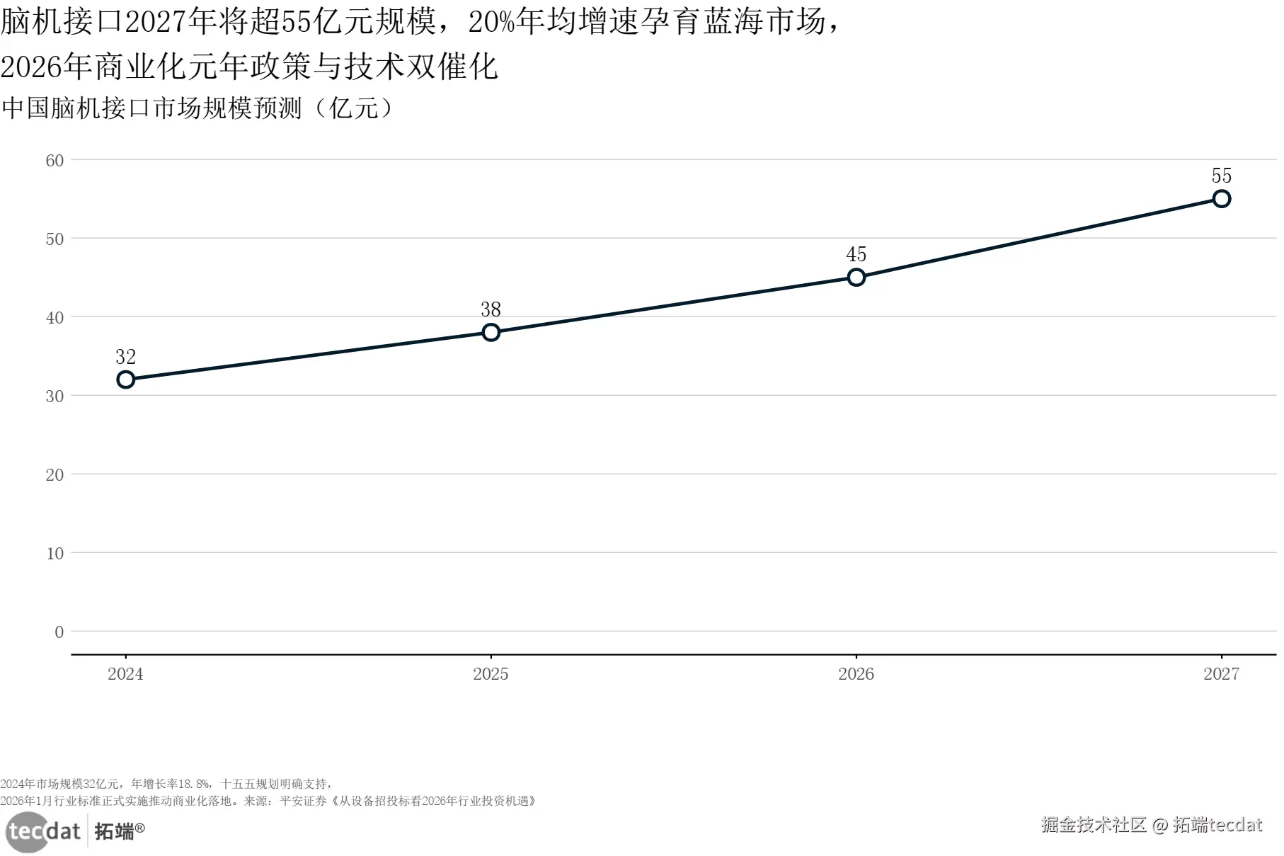 脑机接口市场则处于爆发前夜,2024年市场规模为32亿元,预计2027年将超过55亿元,年复合增长率达20%,2026年被视为行业商业化元年(见图18)。“十五五”规划明确支持脑机接口等未来产业发展,2026年1月行业标准正式实施,将为技术落地提供重要的政策保障。