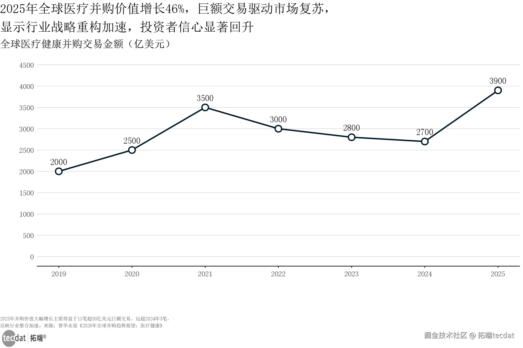 当我们把视角从医院走廊延伸到整个医疗产业链,会发现这场“逆周期火热”正在重构一个价值万亿的市场。2025年全球医疗健康并购交易金额达3900亿美元,同比增长46%,11笔超50亿美元的巨额交易远超2024年的3笔,显示行业整合正在加速(见图7)。