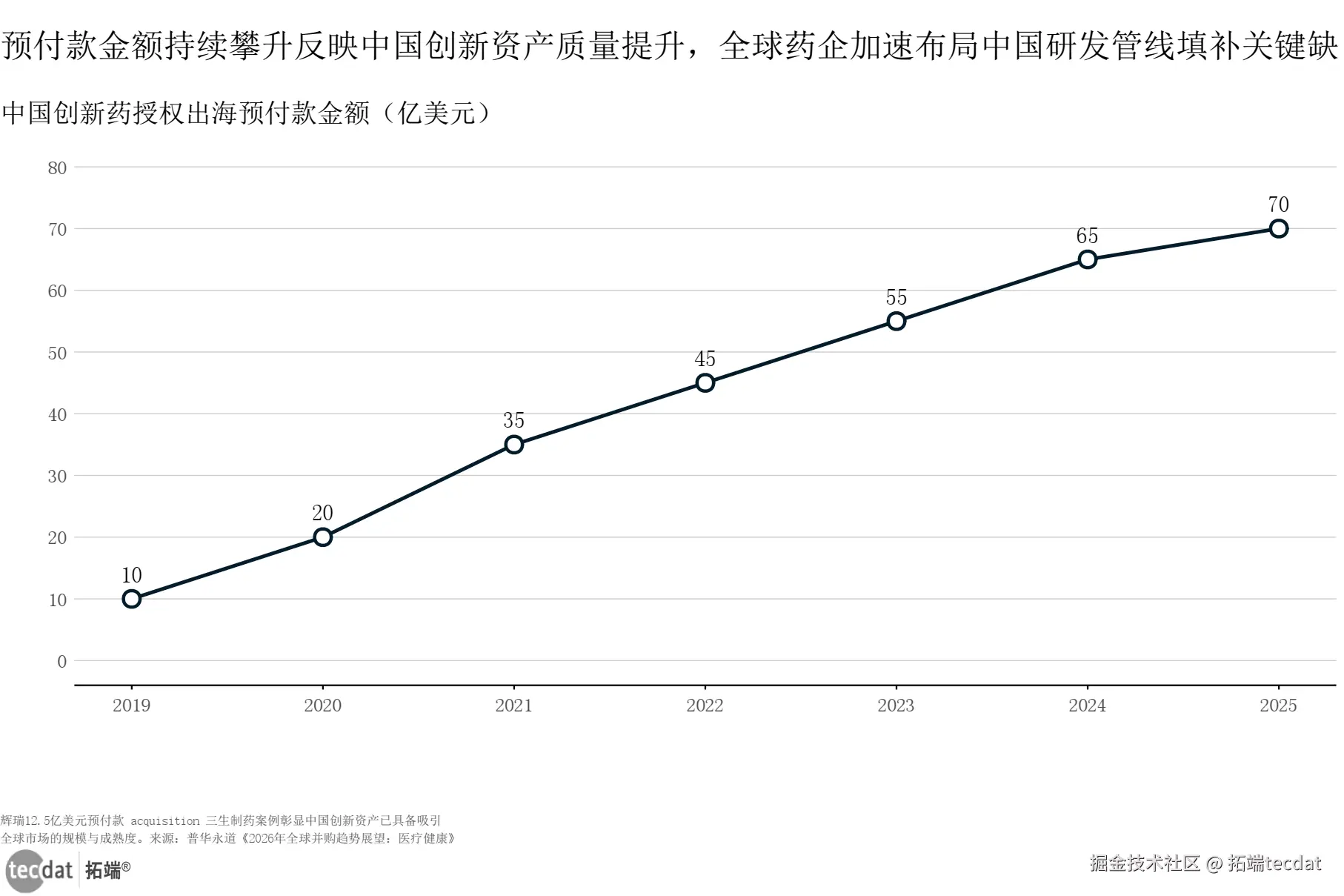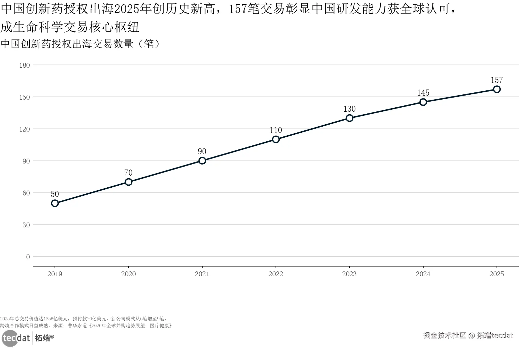 亚太地区成为全球并购增长的引擎,并购数量增长12%,其中中国交易数量同比大增53%,反映出全球创新格局正在向东方转移。中国创新药授权出海在2025年创下157笔交易、总价值1356亿美元的历史新高,预付款达70亿美元,辉瑞12.5亿美元预付款收购三生制药的案例,彰显了中国创新资产的全球吸引力(见图8、图9)。