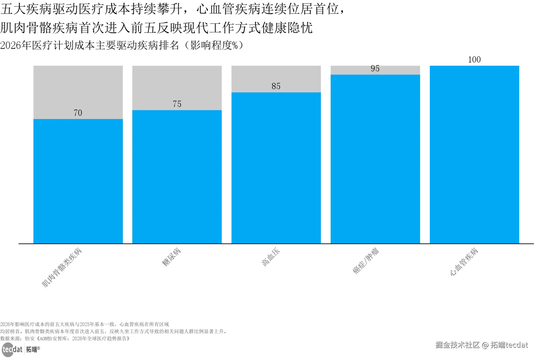 这一现象在全球医疗成本驱动因素中也得到了印证。心血管疾病连续位居影响医疗成本的首位(100%),癌症/肿瘤(95%)、高血压(85%)、糖尿病(75%)紧随其后。值得注意的是,肌肉骨骼类疾病首次进入前五(70%),反映出久坐工作方式和经济压力下过度劳累导致的相关健康问题显著上升(见图4)。