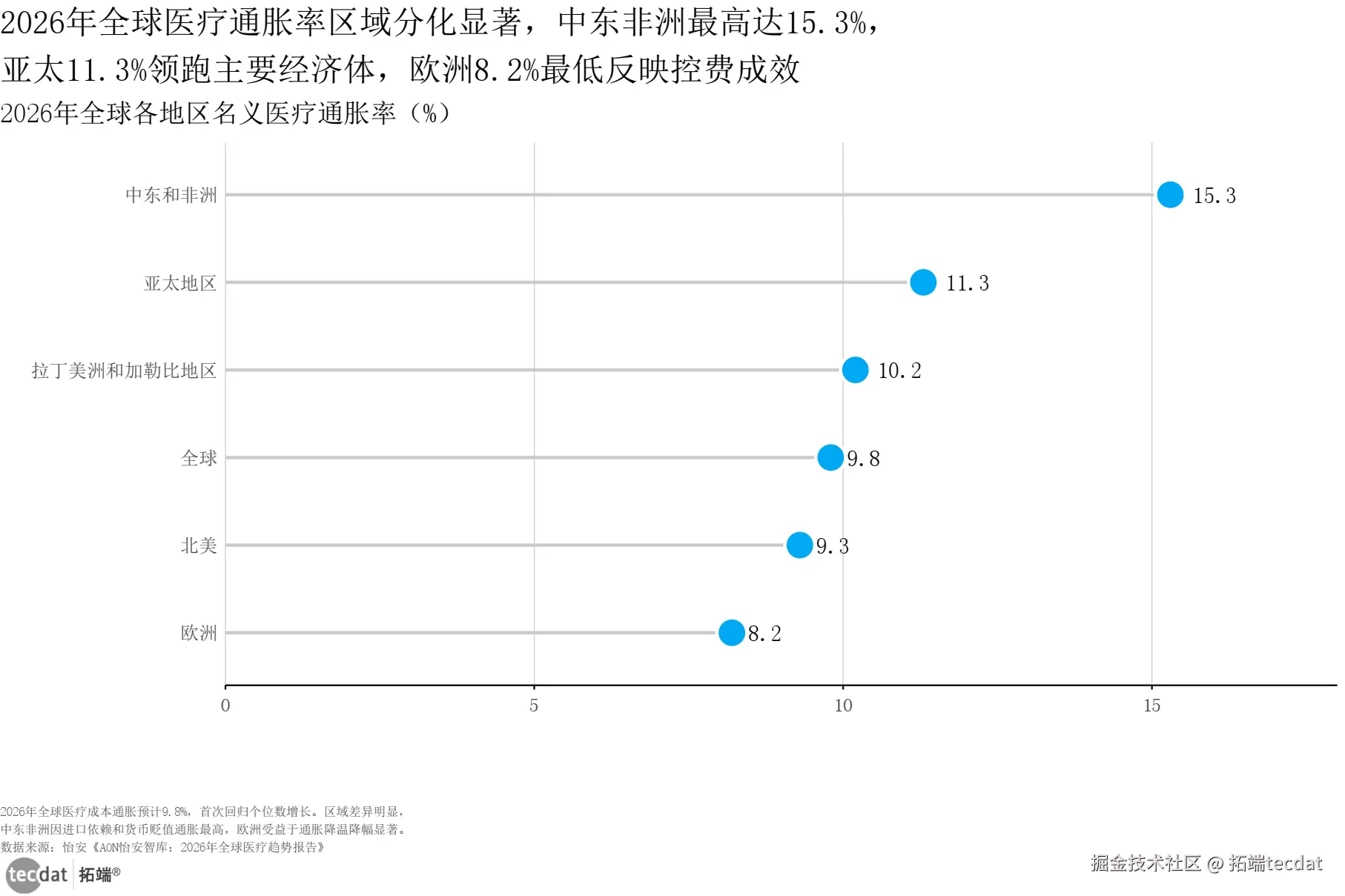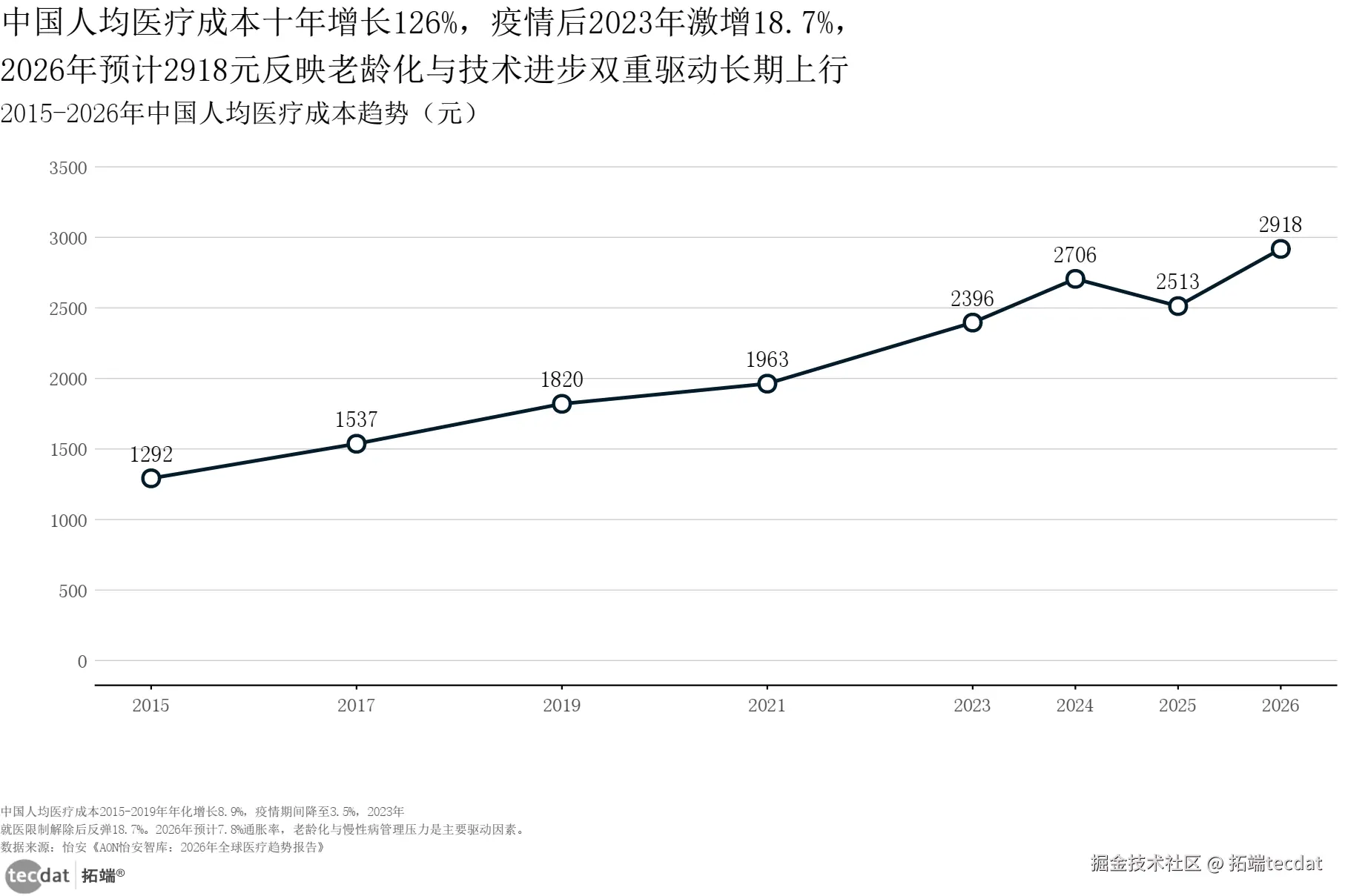 这种医疗行业的逆周期火热并非中国独有,而是全球范围内的普遍现象。根据怡安《2026年全球医疗趋势报告》,2026年全球平均医疗通胀率预计为9.8%,自2023年以来首次回归个位数增长,但区域差异极为显著(见图1)。中东和非洲以15.3%的增速领跑,亚太地区11.3%紧随其后,欧洲仅为8.2%。中国作为亚太地区最大的医疗市场,人均医疗成本十年增长126%,从2015年的1292元增至2026年的2918元,年化增长率达8.5%(见图2)。