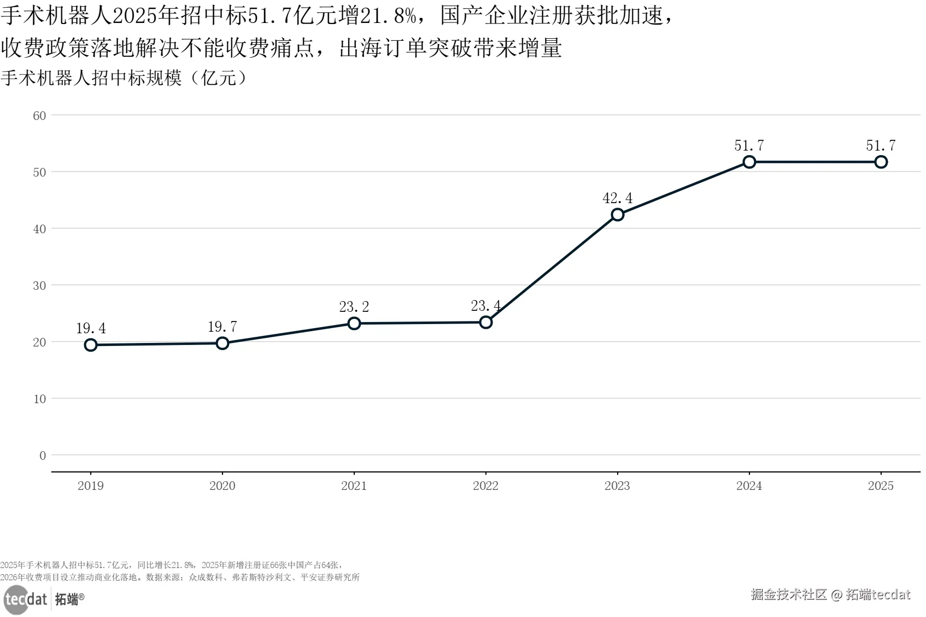 手术机器人和脑机接口等前沿领域也迎来了商业化加速期。2025年手术机器人招中标规模达51.7亿元,同比增长21.8%,2025年新增注册证66张,其中国产占64张(见图16)。