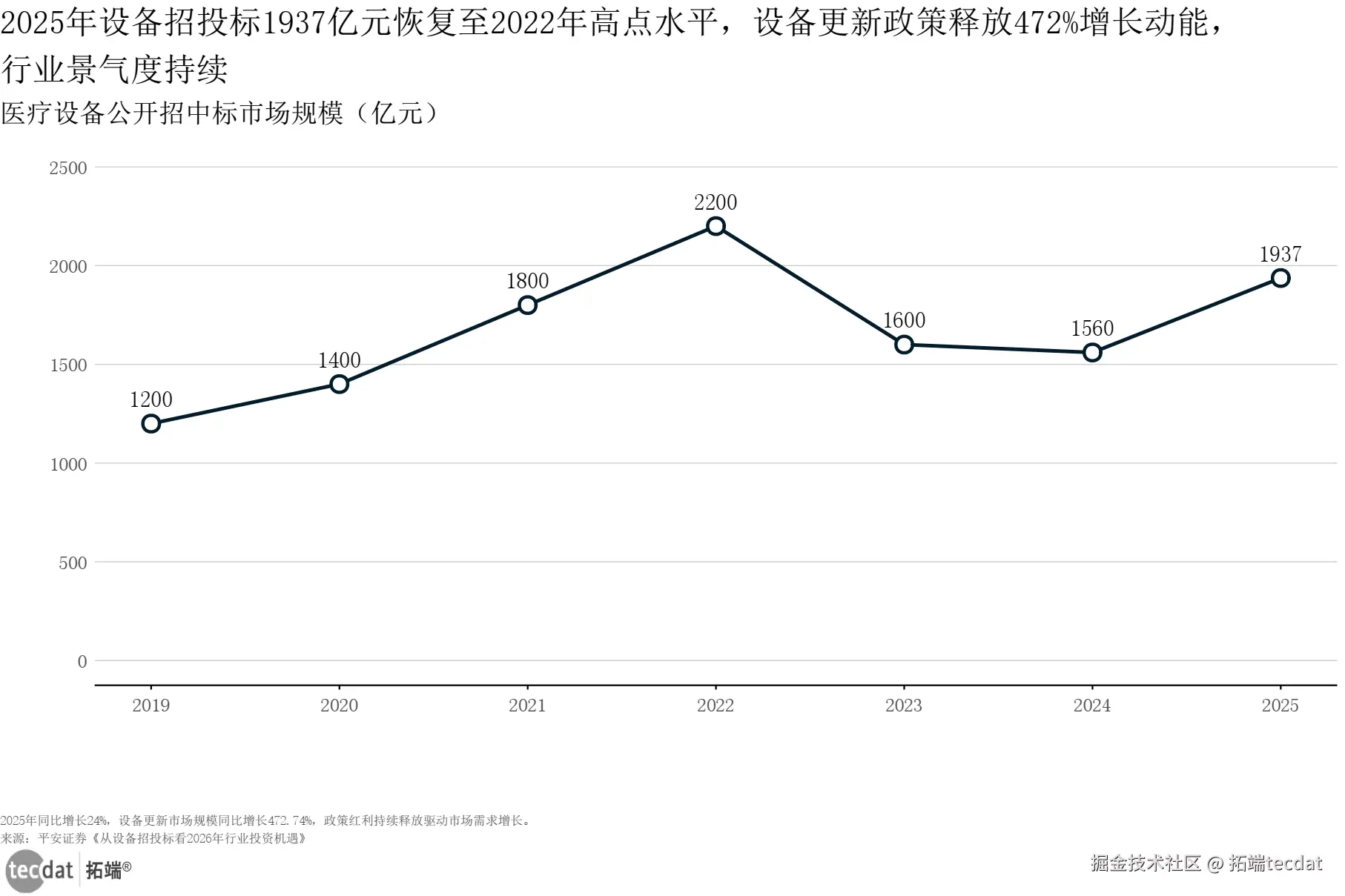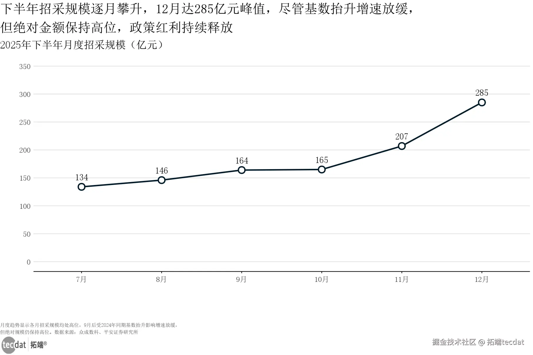 在医疗器械领域,政策红利正在释放出惊人的增长动能。2025年医疗设备公开招中标市场规模达1937亿元,同比增长24%,恢复至2022年高点水平,其中设备更新市场规模同比增长472.7%(见图10)。下半年招采规模逐月攀升,12月达到285亿元的峰值,尽管受基数抬升影响增速放缓,但绝对金额保持高位(见图11)。