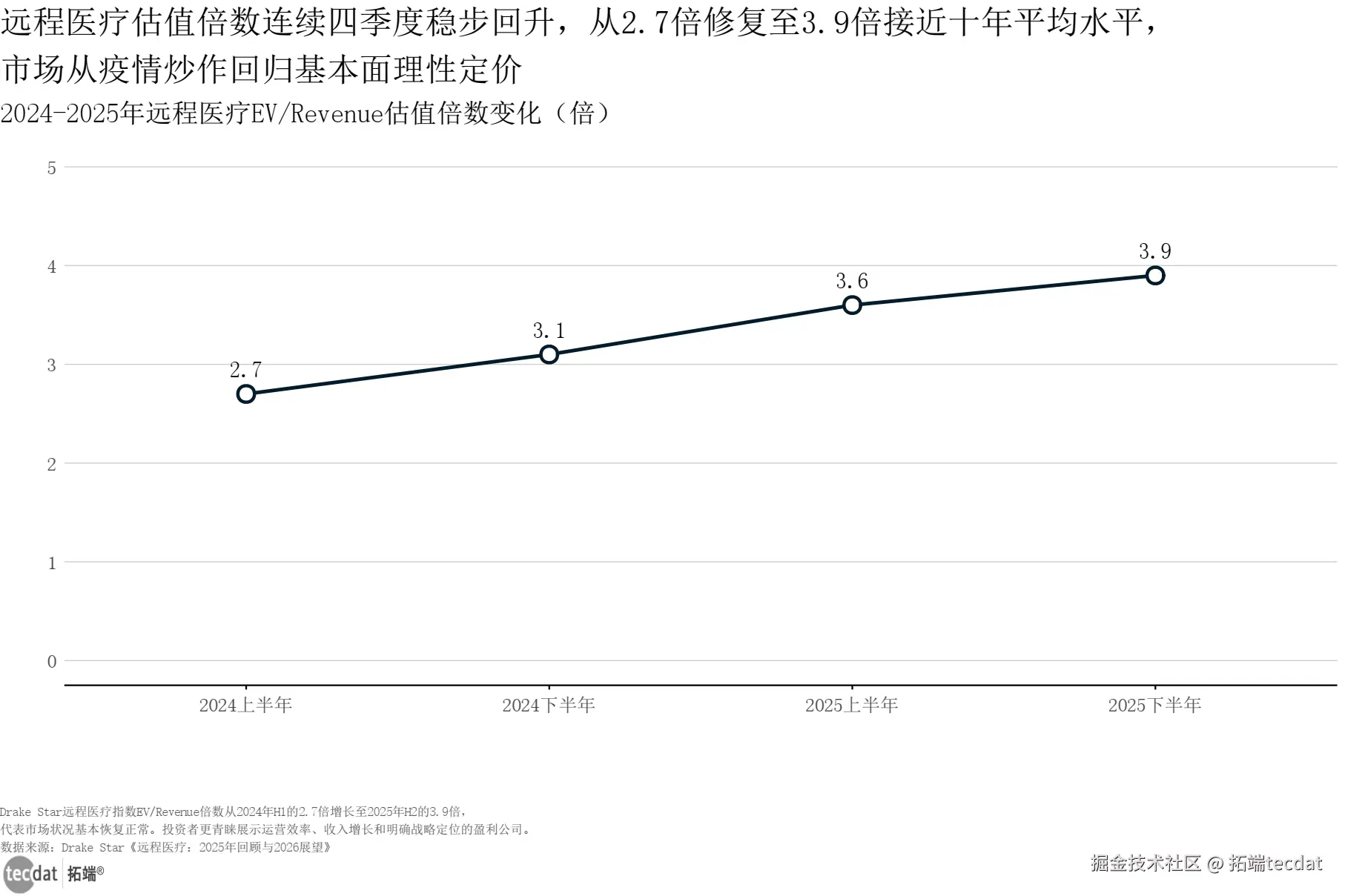 这种线上医疗的爆发式增长也得到了资本市场的验证。2025年远程医疗并购交易达87笔,同比增长64%;融资活动343笔,同比增长107%,创历史新高(见图5)。远程医疗EV/Revenue估值倍数从2024年上半年的2.7倍修复至2025年下半年的3.9倍,接近十年平均水平(见图6)。资本的涌入一方面推动了行业发展,另一方面也进一步加剧了一线医生的工作负荷。