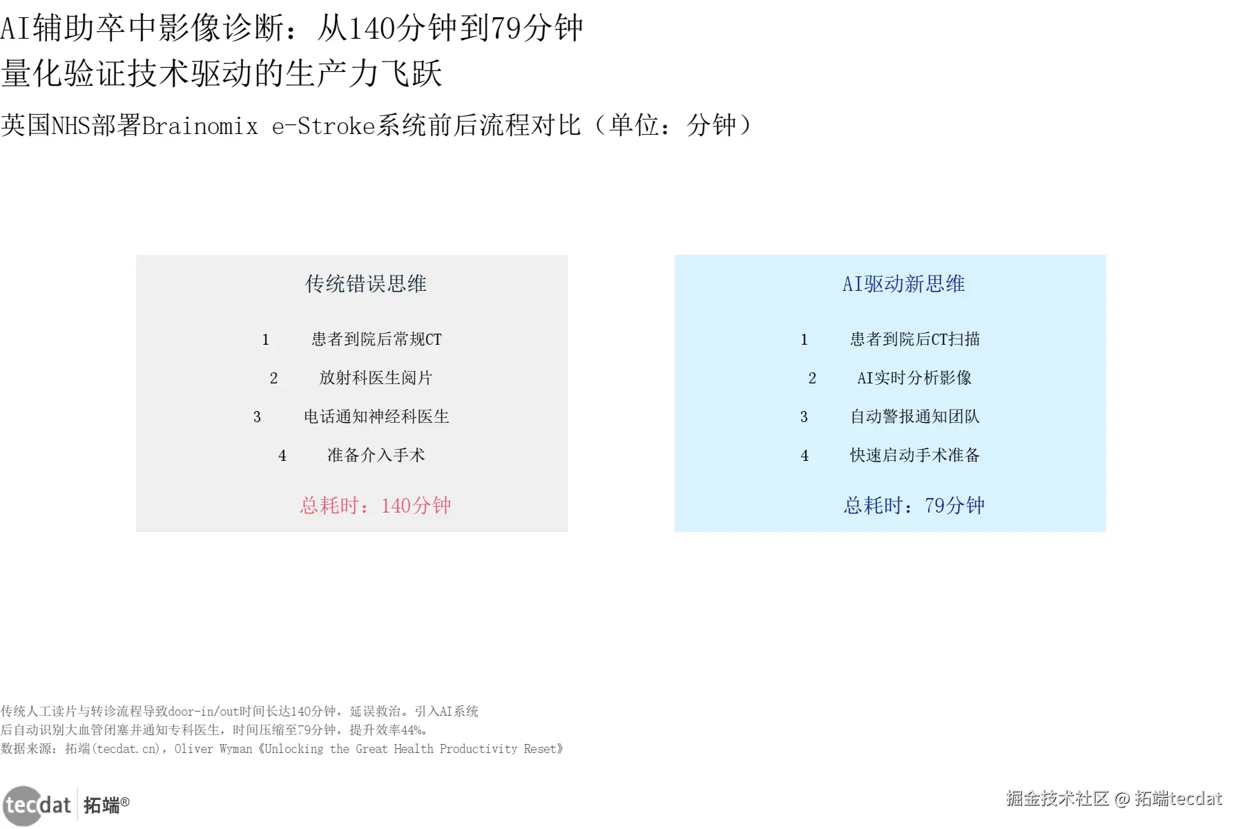 医疗生产力的核心,是在不增加人手、不降低质量的前提下,通过AI、机器人和自动化重新设计工作流,让同样一个医生能服务更多患者,同时自己还不那么累。英国NHS与Brainomix公司合作的e-Stroke系统就是一个典型案例:通过AI算法自动分析脑部CT影像,识别大血管闭塞并实时通知神经介入团队,将患者的Door-in/out时间从传统的140分钟压缩至79分钟,效率提升44%(见图21)。对于脑卒中患者而言,每节省1分钟,就多挽救190万个神经元。