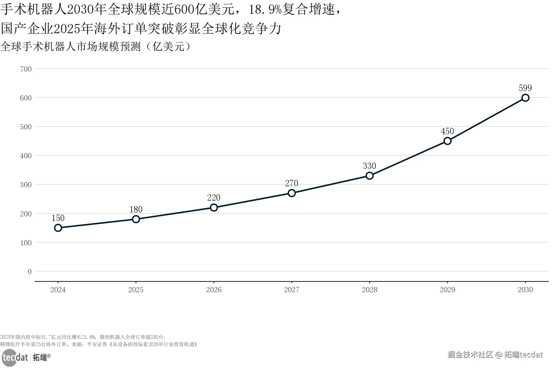 全球手术机器人市场规模预计将从2024年的150亿美元增长至2030年的599亿美元,年复合增长率达18.9%,国产企业如微创机器人全球订单已突破180台,精锋医疗半年获25台海外订单,彰显出全球化竞争力(见图17)。