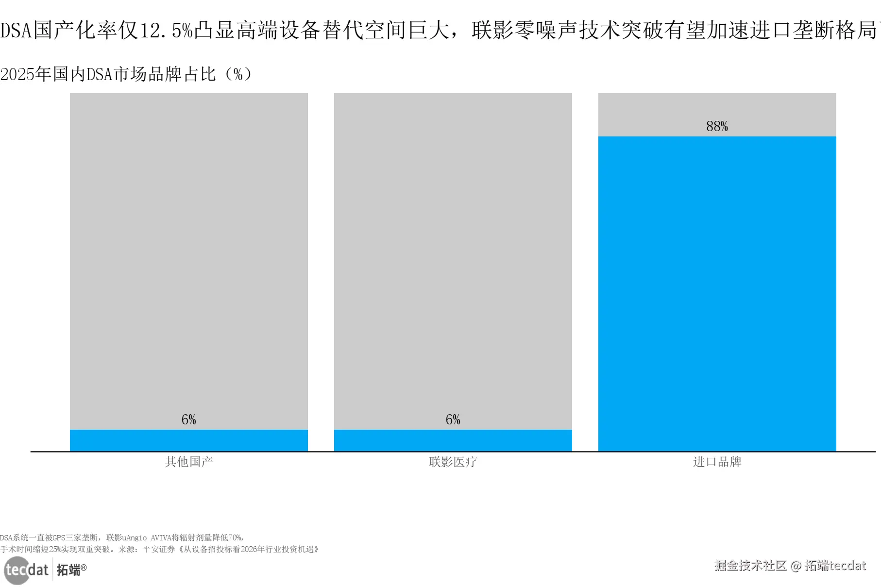 国产替代正在高端领域取得突破性进展。以DSA(数字减影血管造影)系统为例,尽管进口品牌仍占据88%的市场份额,但联影医疗和其他国产品牌已各占6%,国产化率仅12.5%凸显出巨大的替代空间(见图14)。联影uAngio AVIVA将辐射剂量降低70%、手术时间缩短25%的技术突破,正在加速打破GPS三家的垄断格局。