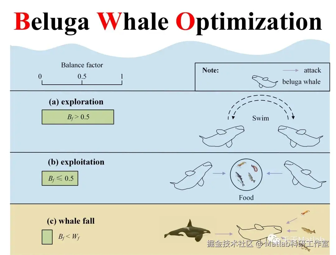 Zhong等人于2022年提出,该算法模拟了白鲸游泳,觅食和“鲸鱼坠落”行为。在本文中,提出了一种基于适应度距离平衡白鲸优化算法(FDBBWO),其灵感来自白鲸的行为,称为白鲸优化