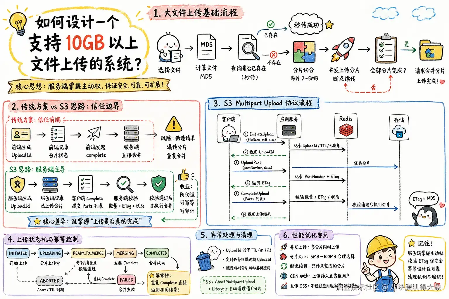 真正拉开差距的,不是会不会说“分片上传”,而是能不能讲清楚:服务端如何掌握上传状态、如何做 ETag 校验、如何保证 complete 幂等、如何清理僵尸分片,以及为什么生产上更推荐直传 OSS / S3。