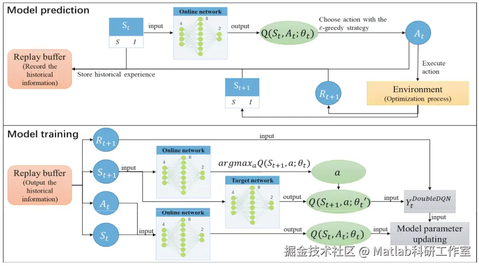 OLDE 算法采用双重深度 Q 网络(Double DQN)构建和维护神经网络模型 。Double DQN 通过引入两个结构相同但参数更新不同的网络 —— 评估网络和目标网络,有效缓解了传统深度 Q 网络(DQN)中因最大化偏差导致的过估计问题 。评估网络用于实时评估当前状态下不同动作的 Q 值,目标网络则为评估网络提供相对稳定的目标值,减少训练过程中的波动 。