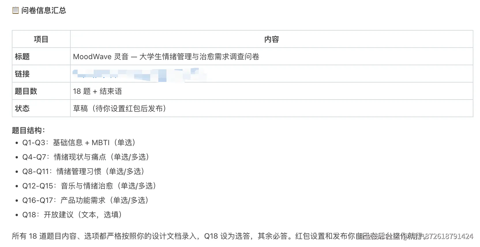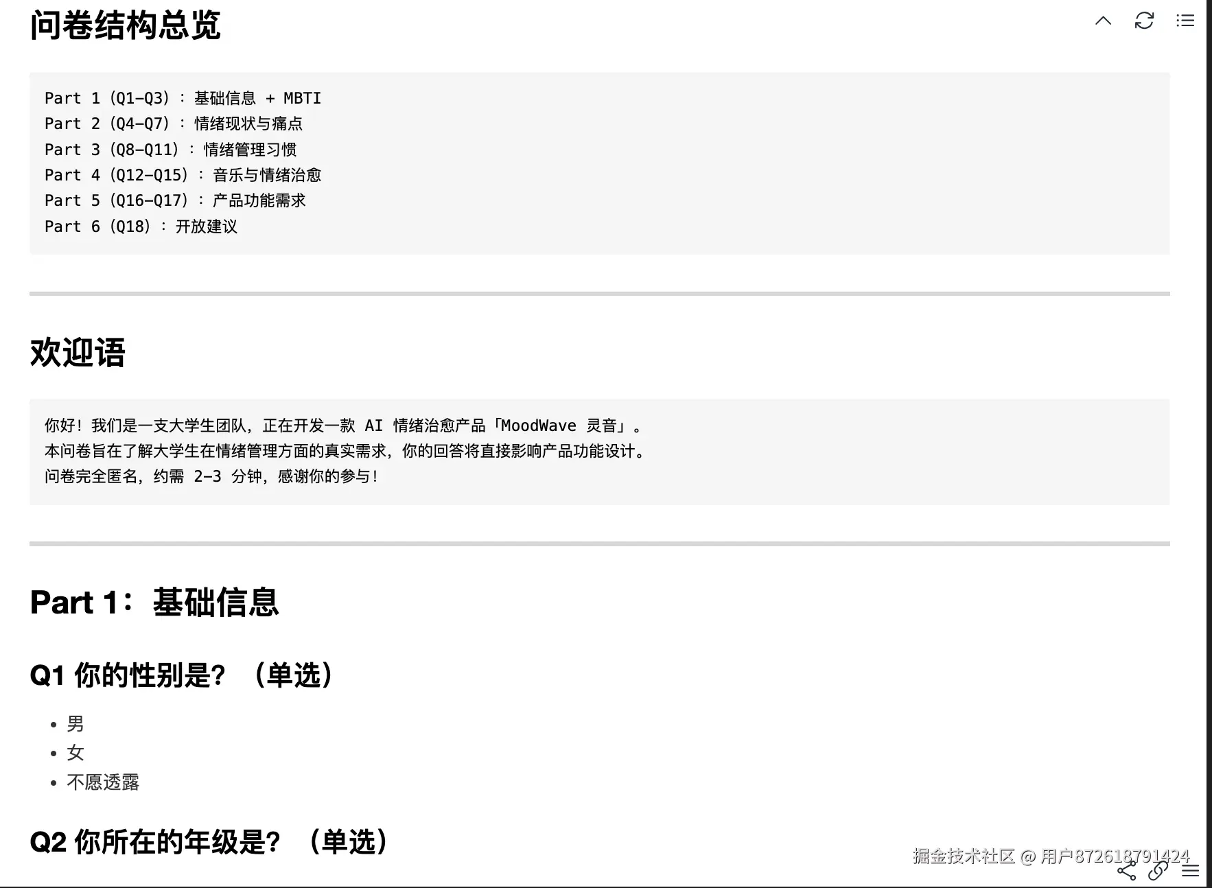 | 音乐治愈 | Q12-Q15 | 音乐调节习惯、AI 音乐兴趣 | 验证"音乐治愈"差异化路线 |