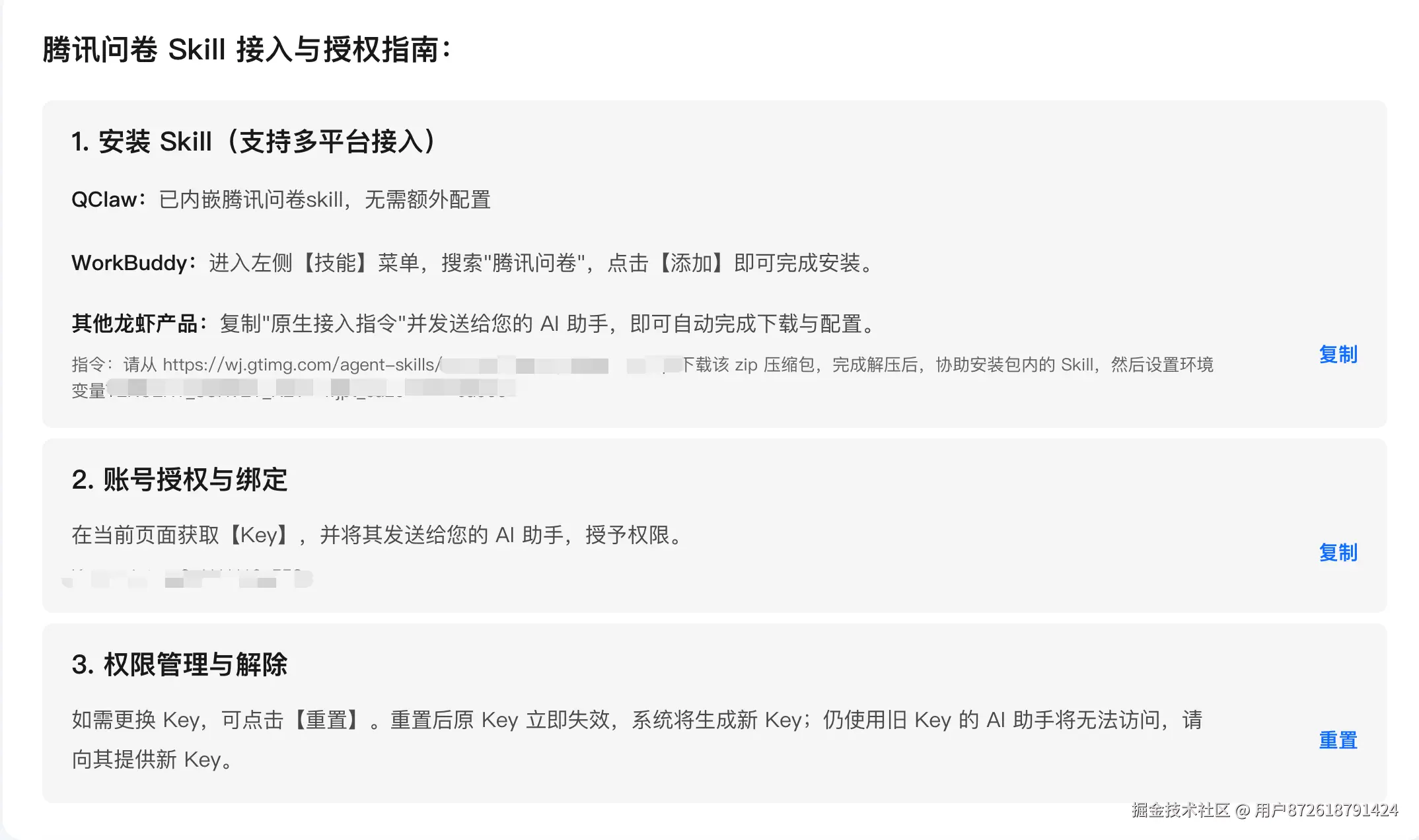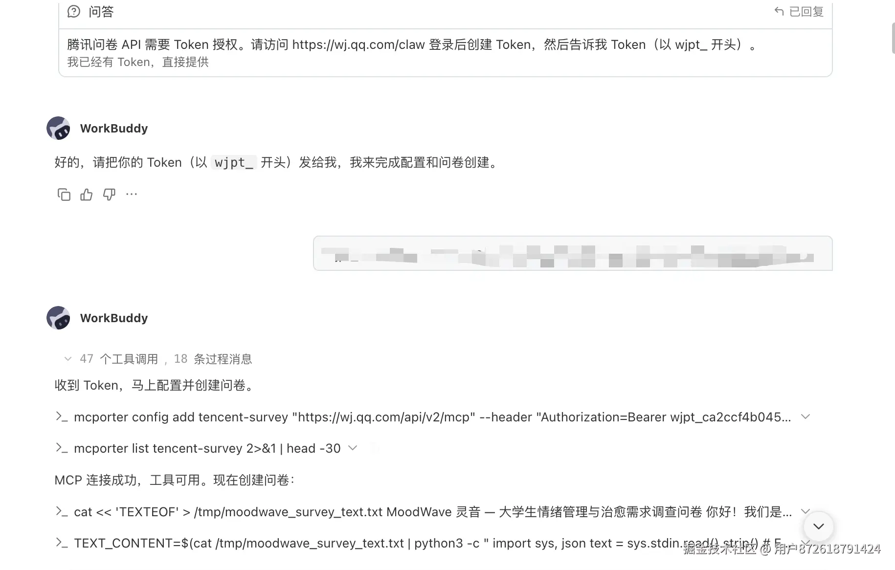 在 WorkBuddy 中加载「腾讯问卷」Skill 后,只需要做一次鉴权配置: