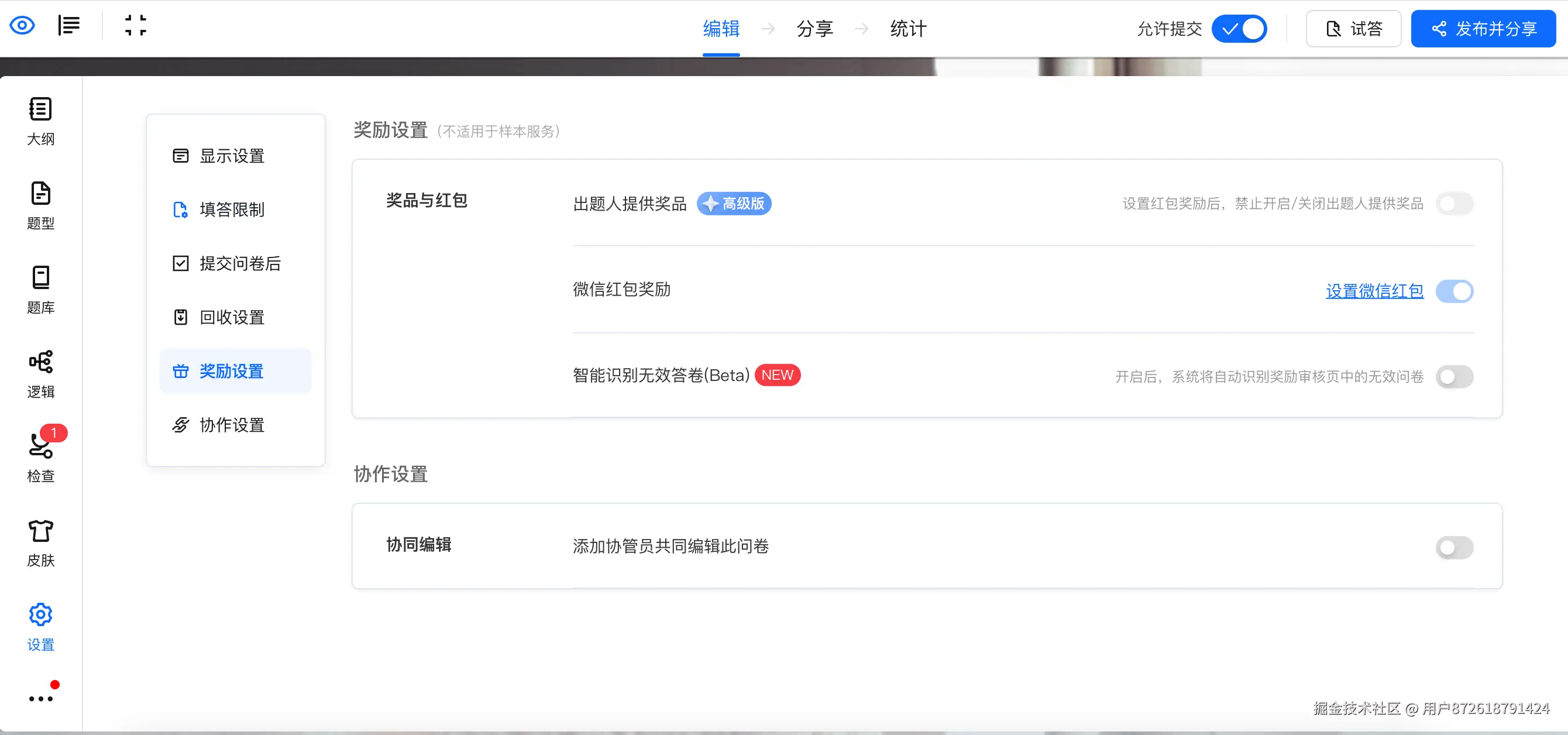 拿到问卷链接后,在腾讯问卷后台做最后检查,设置红包金额和发放规则,然后开启回收。