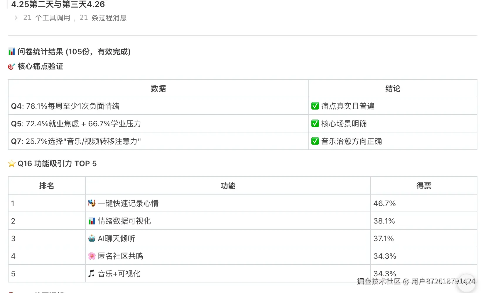 前者帮你发现"用户在关心什么",后者帮你确认"用户到底需要什么"。比如线上"情绪雷达"发现了"考研焦虑"是大方向,线下问卷则帮我确认了"界面要干净""快速记录是第一需求""社区要做轻社交"这些具体的设计原则。两者结合,你拿到的就不是一个模糊的"我觉得用户需要这个",而是有数据支撑的"用户确实需要这个,而且需求强度是这样的"。