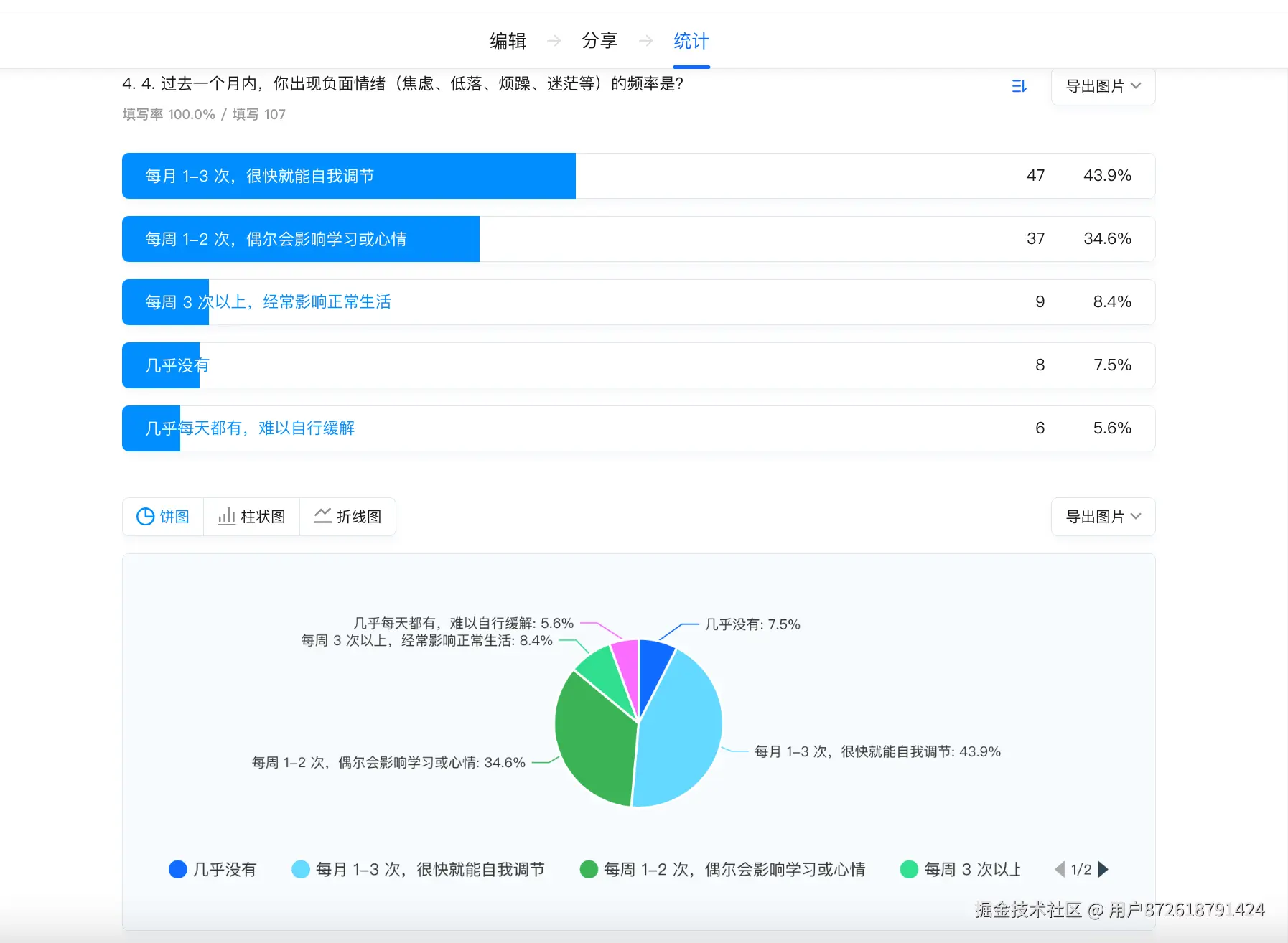 1. 负面情绪非常普遍——78.1% 每周至少出现 1 次。Q4 数据显示,43.8% 的受访者每月 1-3 次、34.3% 每周 1-2 次、8.6% 每周 3 次以上、5.7% 几乎每天都有。只有 7.6% 表示"几乎没有"。这和"情绪雷达"抓到的高频关键词"精神内耗""焦虑"完全吻合,线上线下的结论一致。