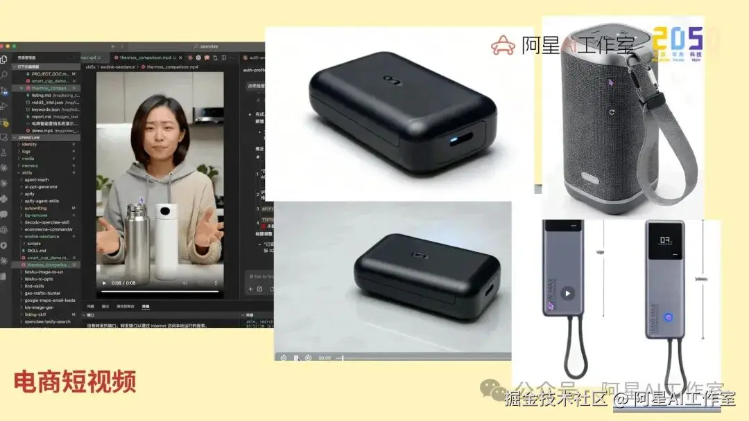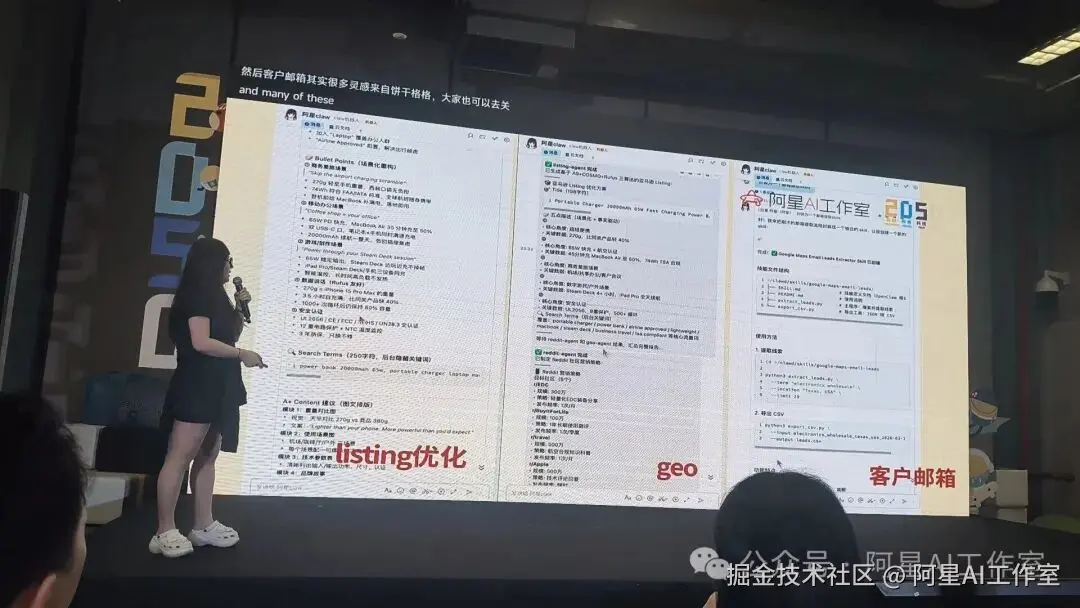 也做了很多工作流。身边做电商的朋友,其实非常需要这些东西。比如 Geo、Listings、客户邮件、种草报告、产品短视频,这些都可以通过龙虾、Skills 或者其他自动化工具来完成。现在一些公司做出来的 Skills 已经非常商用级,所以你会发现,单纯学某个技术不一定永远有用,因为更新实在太快。