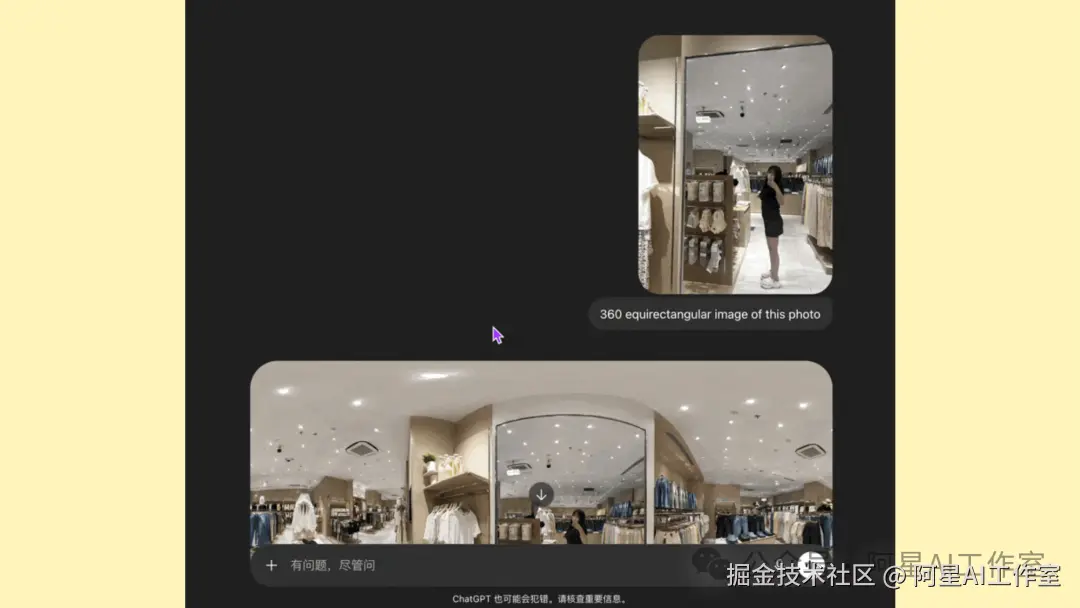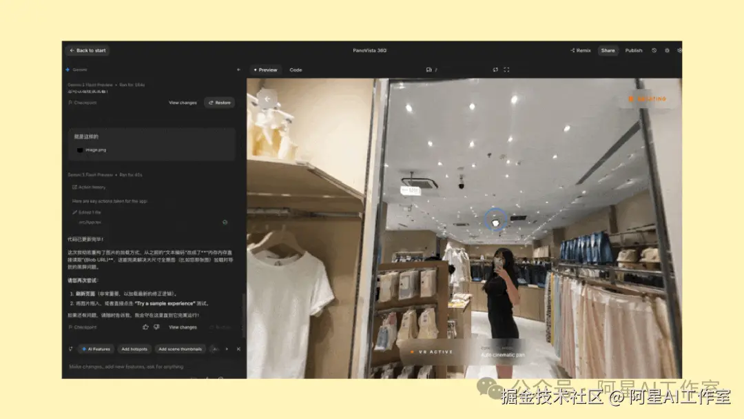 比如微信群里有个老师做了一个效果,我看完之后反推了一下:我可以用自己的自拍,先用 GPT Image 2 做处理,再让 Google AI Studio 做成 360 度效果。这个东西不一定准确,也不能保证像专业 360 度相机一样,但它特别适合做 Web Coding。因为它不一定有实用价值,但一定吸眼球。